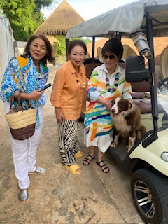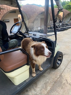 ทีแรก ก็แอบใจเสียเล็กน้อยเมื่อสุดทางแสนแคบ มีประตูเหล็กเล็กๆคล้ายตามบ้านตากอากาศหัวหินของพวกผู้ดีเก่า ติดป้ายชื่อรีสอร์ทไว้ แต่พอเลี้ยวเข้าไปก็โล่งอก เพราะมีสวนตกแต่งแบบน่ารัก ไม่มากไม่น้อย เข้าไปเช็คอินที่เคาน์เตอร์กึ่งห้องอาหารโปร่งตา มองเห็นวิวรอบทิศทางผ่านสระว่ายน้ำเลยไปถึงริมแม่น้ำโน่น แล้วก็นั่งรถกอล์ฟลงเนินสูง เลี้ยวหักศอกไป2-3โค้งไปยังแพที่พัก ที่ลอยอยู่บนลำน้ำแควน้อย โดยมีพนักงานต้อนรับชื่อสตรองบอย เป็นหนุ่มน้อยชาวต่างชาติแสนสุภาพ โหงวเฮ้งเป็นมิตร มีผมยาว สลวย สีน้ำตาล กระโดดขึ้นมานั่งด้านหน้าคู่คนขับอย่างเงียบๆนำเราไปส่งถึงแพที่พัก… ลืมบอกไปว่าพนักงานต้อนรับคนนี้เขามี4ขาค่ะ เป็นหมาชาย พันธุ์ English Shepherd และถ้าเห็นพวกเรามัวโอ้เอ้ถ่ายรูปไม่รู้จักขึ้นรถกอล์ฟสักที เค้าก็จะคาบก้อนหินมาวางที่พื้นรถดังกร็อก เป็นการเตือนอย่างสุภาพว่ารถจะออกแล้วนะครับคุณป้า!