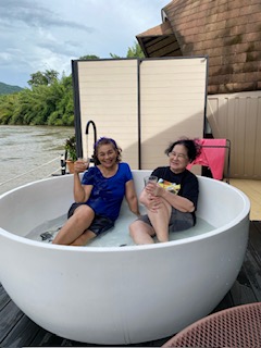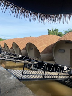 ที่พักของเรามีรูปร่างเหมือนไข่นกกระจอกเทศยักษ์วางเรียงกันบนพื้นน้ำประมาณแปดถึง 10 ฟอง ด้านหน้าริมแม่น้ำมีบันได ไต่ลงไปสู่แม่น้ำเผื่อใครจะอยากลงไปนั่งแกว่งขาเล่นในลำน้ำเชี่ยวให้เสียวเล่น บนระเบียงกว้างวางอ่างอาบน้ำทรงกลมไว้ นอน แช่ bubble bath ระหว่างจิบไวน์ชมจันทร์ โรงแรมนี้มีสัปปายะดีมาก ขอบอก จะเลือกมา honeymoon หรือมาปฏิบัติธรรมก็ได้(แหม! คนละฟีลลิ่งเลย!) เหมาะที่จะจ้องมองกระแสน้ำที่ไหลเชี่ยวเพื่อพิจารณาว่า เวลาและวารีไม่คอยใคร จะรีบกินรีบเที่ยวก็จงทำซะ ไม่ก็ทอดสายตาไปยังฝั่งตรงข้ามที่ไร้สิ่งปลูกสร้างใดใดโดยสิ้นเชิงยกเว้นผืนป่าไม้เขียวขจีที่เย็นตา