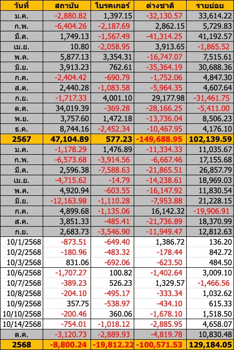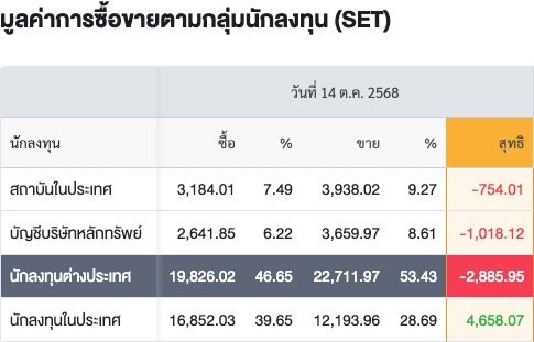 Sinthorn Summary 14/10/2568 : ต่างชาติขายสุทธิ -2,885.95 ลบ.