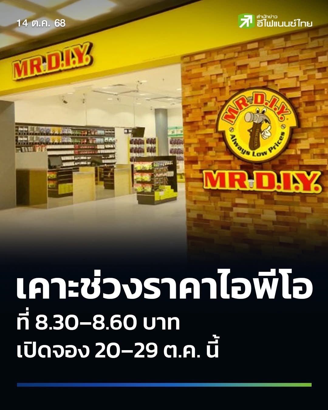 "มิสเตอร์.ดี.ไอ.วาย.โฮลดิ้งฯ (MRDIYT)" กำหนดช่วงราคาขาย IPO ที่ 8.30–8.60 บาทต่อหุ้น เปิดจองซื้อ 20–22 ต.ค.สำหรับบุคคลตามดุลพินิจและผู้มีความสัมพันธ์ของบริษัท และนักลงทุนสถาบันทั้งในและต่างประเทศ จองซื้อ 27–29 ต.ค.นี้ เตรียมเข้าเทรด SET