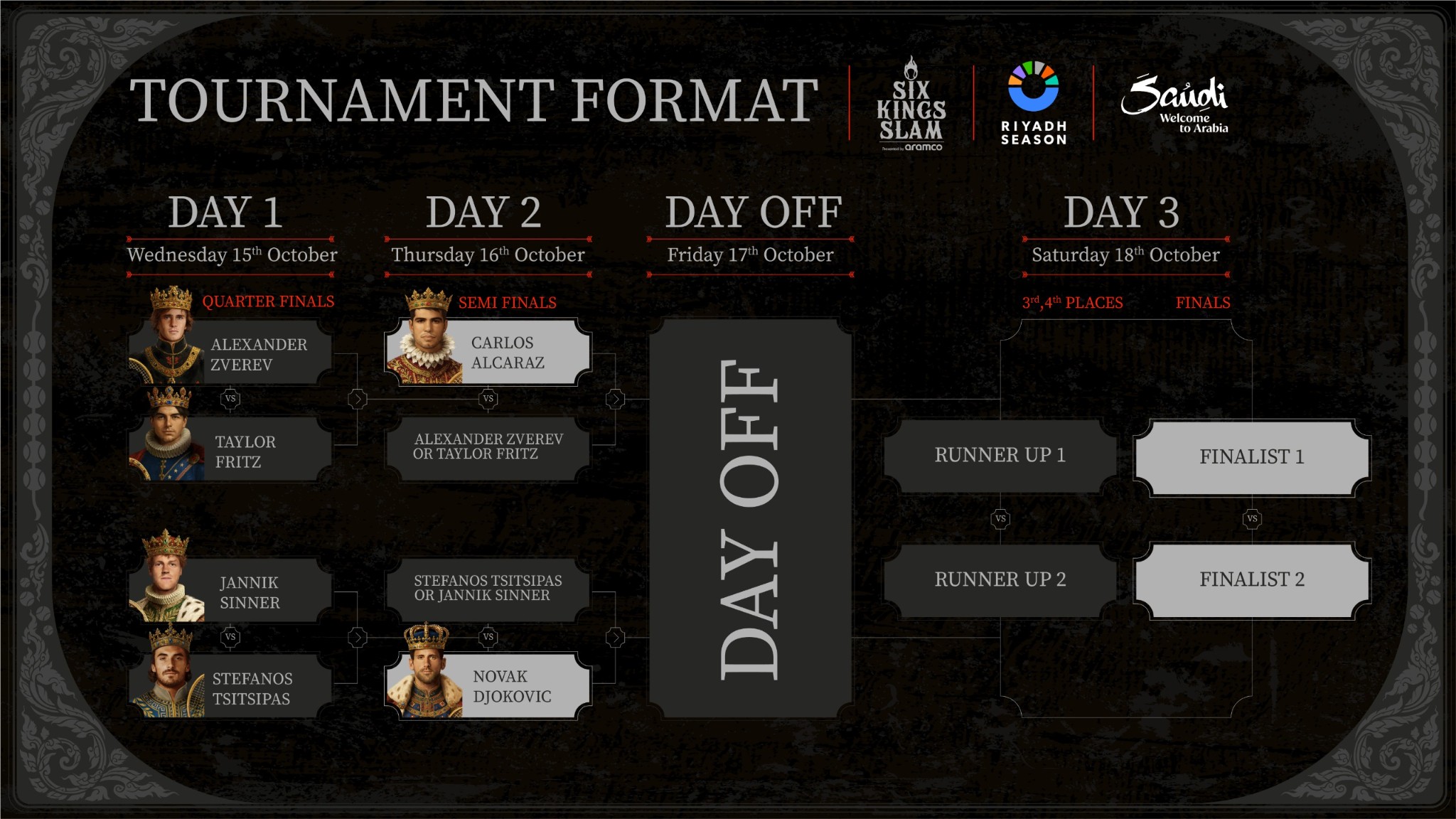 รายการกระชับมิตร Six Kings Slam จัดขึ้นเป็นปีที่สอง ที่กรุงริยาดห์ เมืองหลวงของประเทศซาอุดิอาระเบีย จริงๆการแข่งขันใช้เวลา 3 วันเท่านั้น แต่การแข่งกระชับมิตร จะแข่งต่อเนื่องกันได้ไม่เกิน 3 วันตามกฎของ ATP เลยจะแข่ง 15-16 ตุลาคม หยุด 17 ตุลาคม และแข่งวันสุดท้าย 18 ตุลาคม 2568