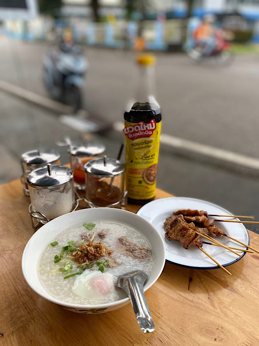 วันที่ฝนตก 🌧️ จขกท. แวะร้านขายโจ๊ก 🥣 มาทานด้วยกันครับ หมูย่าง 🍢 ไข่ลวก 🥚