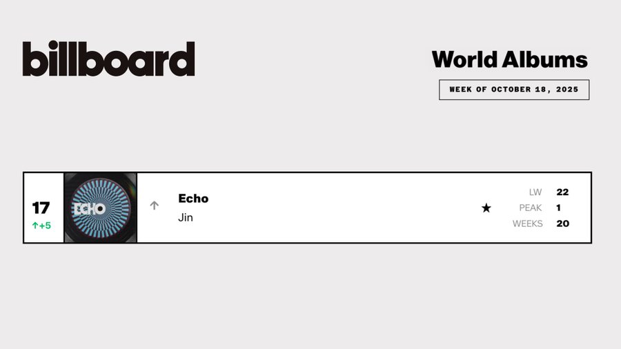 'จิน BTS' สร้างประวัติศาสตร์! อัลบั้ม 'ECHO' ติดชาร์ต Billboard World Albums นาน 20 สัปดาห์!