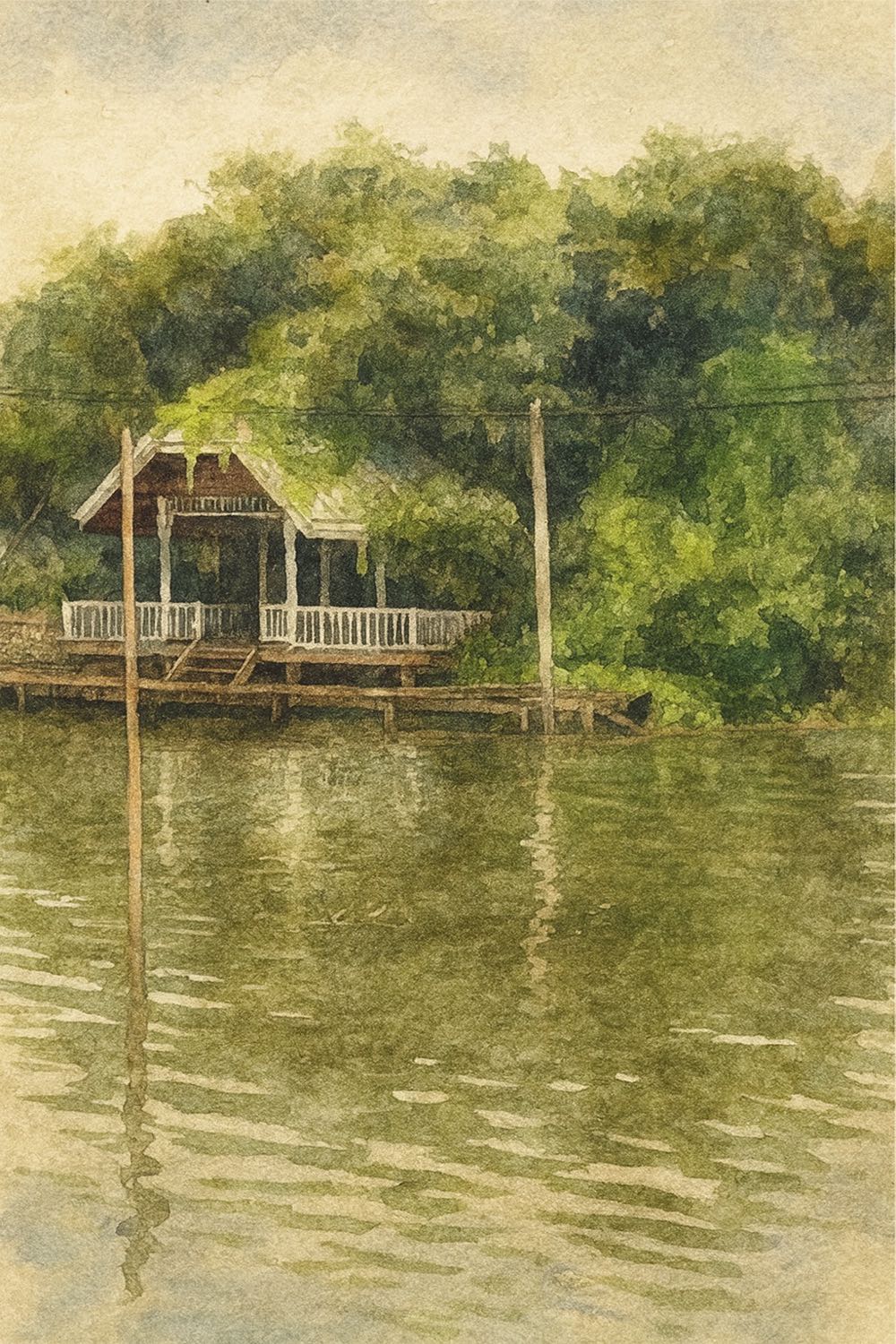ฝั่งตรงข้ามคลอง มีบ้านหลังหนึ่งซ่อนตัวอยู่ในร่มเงาไม้ใหญ่ ศาลาไม้ของมันยื่นออกไปในน้ำเหมือนแขนที่รอใครบางคนกลับมา