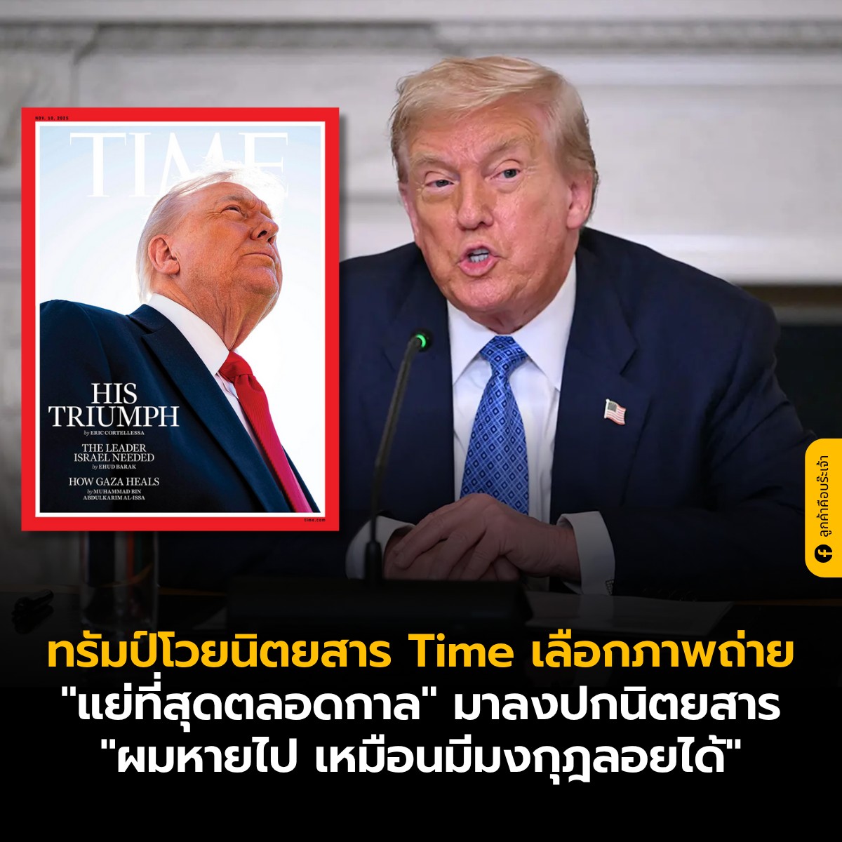 ทรัมป์โวยนิตยสาร Time เลือกภาพถ่าย "แย่ที่สุดตลอดกาล" มาลงปกนิตยสาร "ผมหายไป เหมือนมีมงกุฎลอยได้"