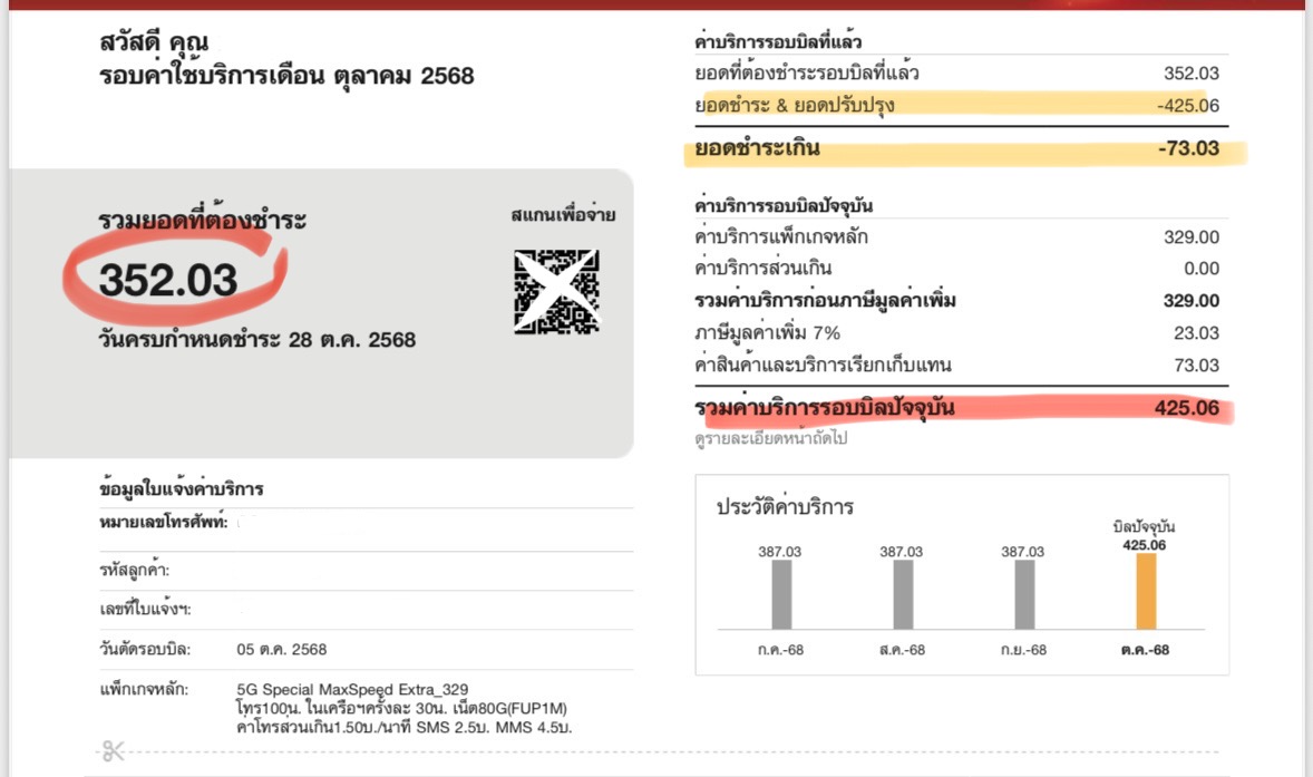 พอดีสงสัยค่ะ ว่ายอดชำระ & ยอดปรับปรุงของทรูที่ติด -ลบ มาจากไหน ยอดที่ต้องชำระ 352 กับยอดรวมค่าบริการที่ต้องจ่าย 425 ก็สงสัยแล้วพอแสกน
