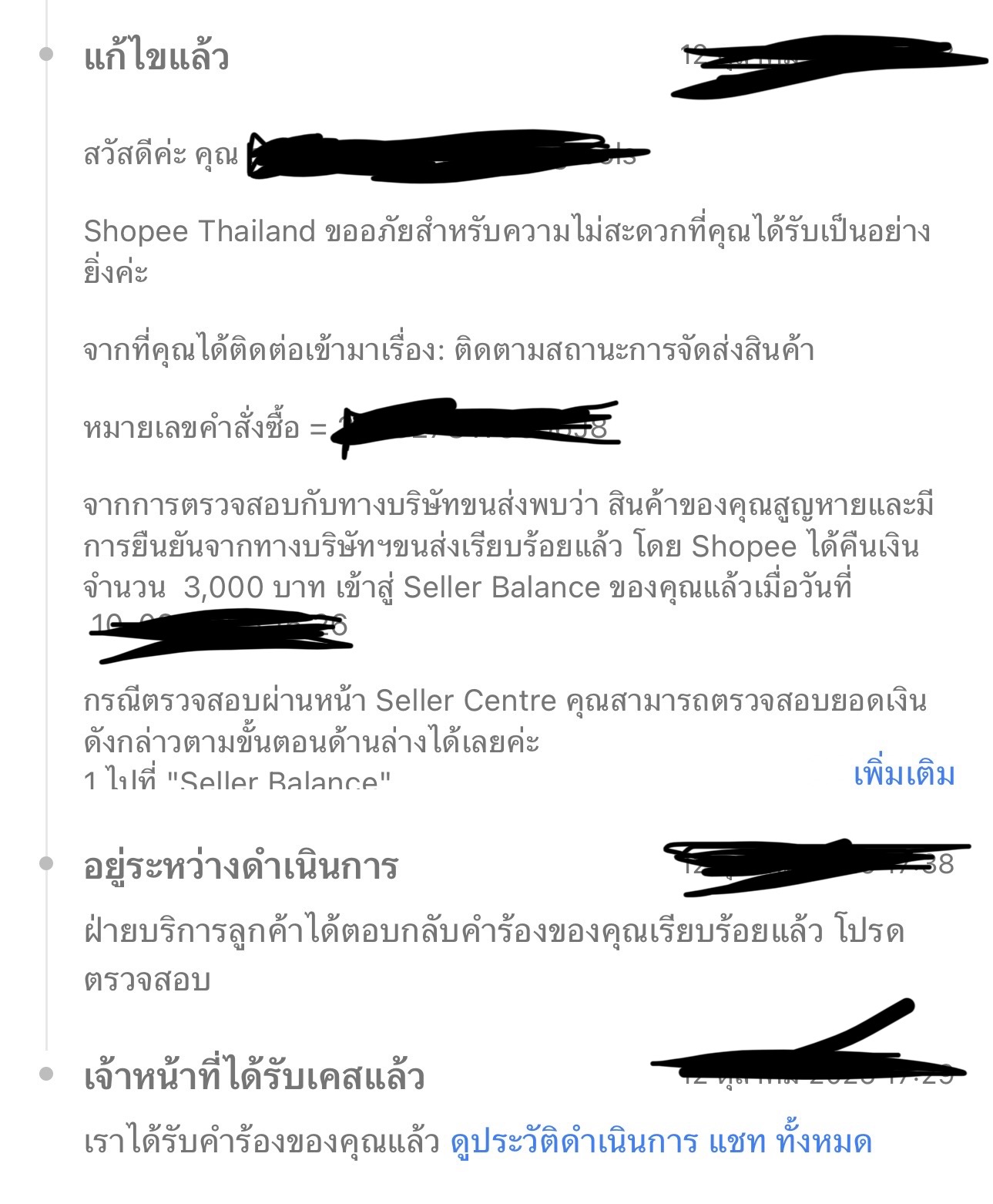 ต่อมาเราเลยได้ทำการทำเรื่องคืนเงินให้กับลูกค้า ได้แบบไม่มีปัญหา และได้ทำเรื่องขอให้ Shopee รับผิดชอบสินค้าเราของเราที่สูญหาย