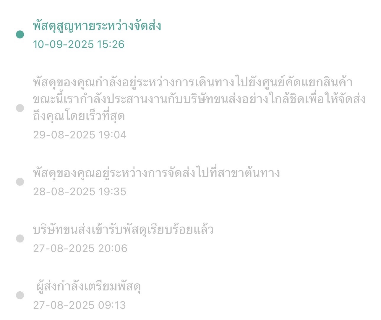 ตั้งแต่วันที่ 27-08-2025 จนยาวมาถึง วันที่ 10-09-2025 ถึงจะรู้ว่าพัสดุสูญหายระหว่างจัดส่ง กล่องไม่ใช่เล็ก น้ำหนักเกือบ 15 kg โคตรแปลก หายสาบสูญ