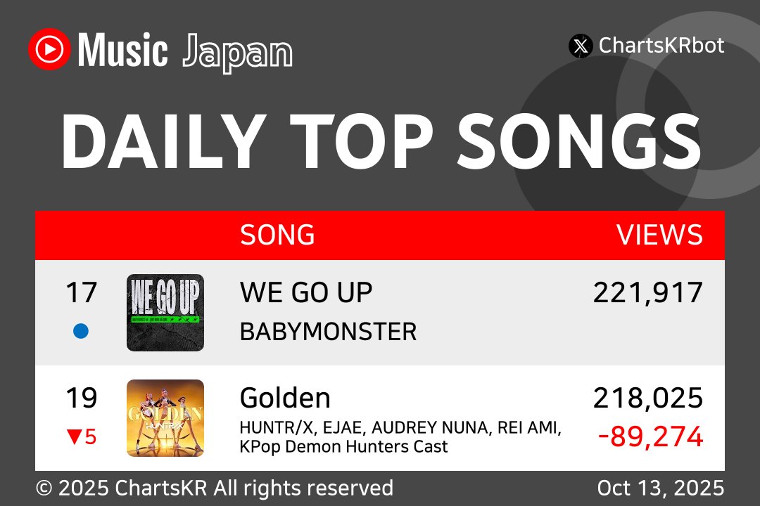 เพลง WE GO UP ของ BABYMONSTER อยู่อันดับ 17 บน YouTube Music Japan เป็นเพลงจากศิลปินเคป๊อปที่อยู่ในอันดับสูงสุด