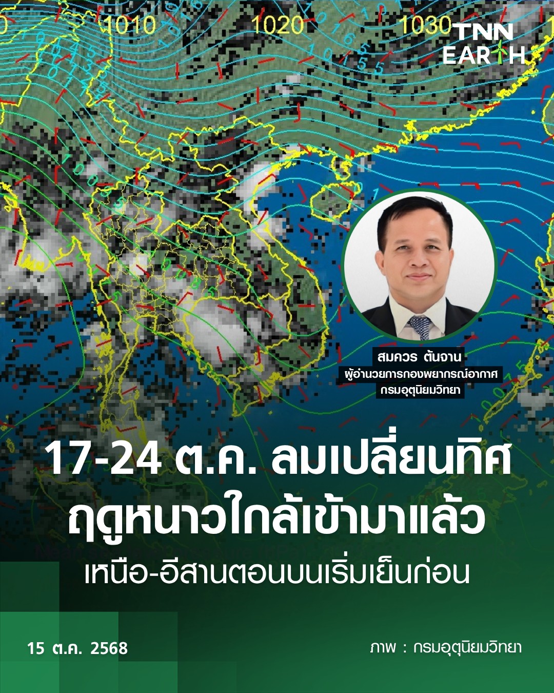 จากนั้น 17-24 ต.ค. ลมเริ่มเปลี่ยนทิศ ช่วงแรกมีฝนฟ้าคะนองก่อนจากนั้นอากาศจะเย็นลง โดยเฉพาะบริเวณภาคเหนือและอีสานตอนบน
