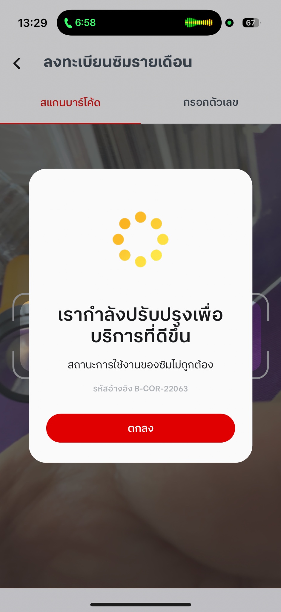 ซิม dtac เติมเงิน ลงทะเบียนไม่ได้ลงผ่าน app true ปัญหา 1.ถ่ายรูป ลงทะเบียน ค้างนานมากไม่มีให้ upload 2.พอ upload ได้ เข้าหน้า ตรวจสอบ ค้างมา เกือบ 30 นาทีแล้วไม่ใีอะไรเกิดขึ้น 3.พอลงใหม่ ถ่ายรูปบัตร