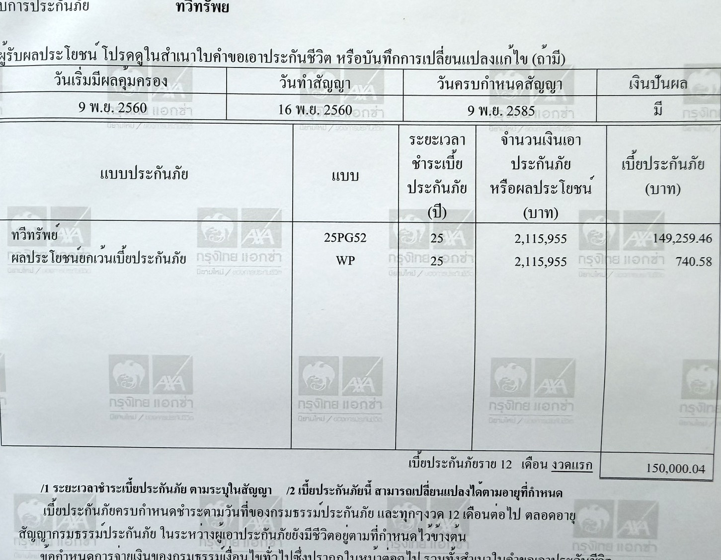 ประกันฉบับนี้เป็นชื่อเรา แต่คุณยายเป็นคนจ่ายค่ะ ปีละ 150,000 (ซึ่งเยอะมากๆ) ทำไว้ตั้งแต่ปี 2560