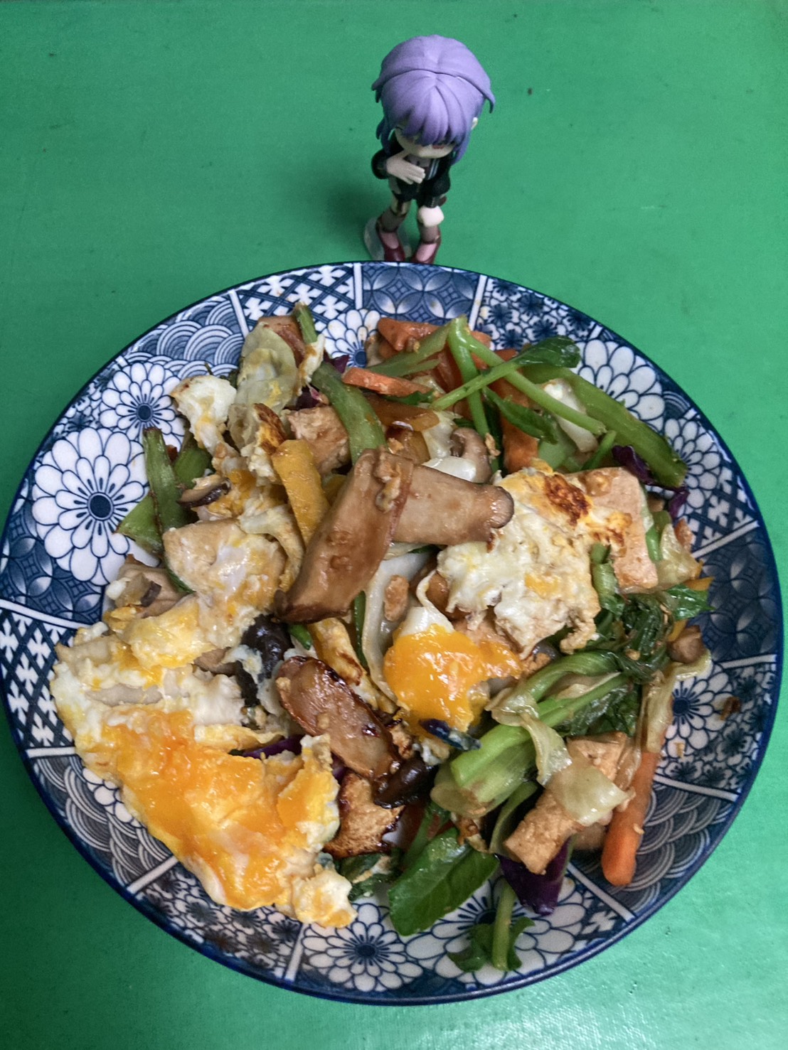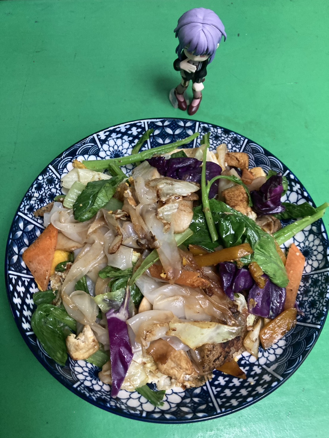อยากกินผัดซีอิ้วแต่ไม่อยากกินแป้ง เลยเอาเห็ดออรินจิมาจี่ในกระทะเทปล่อน มีผักอะไรก็ใส่ๆไป ส่วนของน้องผัดด้วยเส้นใหญ่ค่ะ