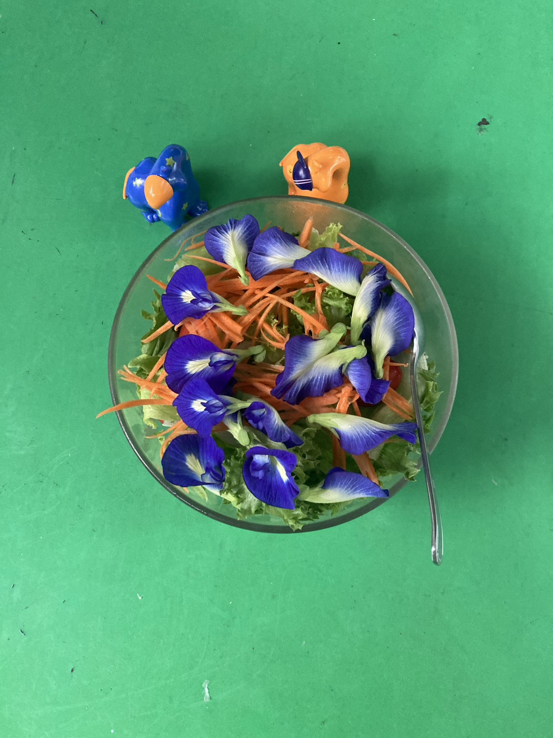 กลัวร่างกายขาดแคลนผัก เลยต้องมีสลัดผักชามโตๆ ดอกอัญชันบานเต็มต้น เก็บมาโรยชามสลัด