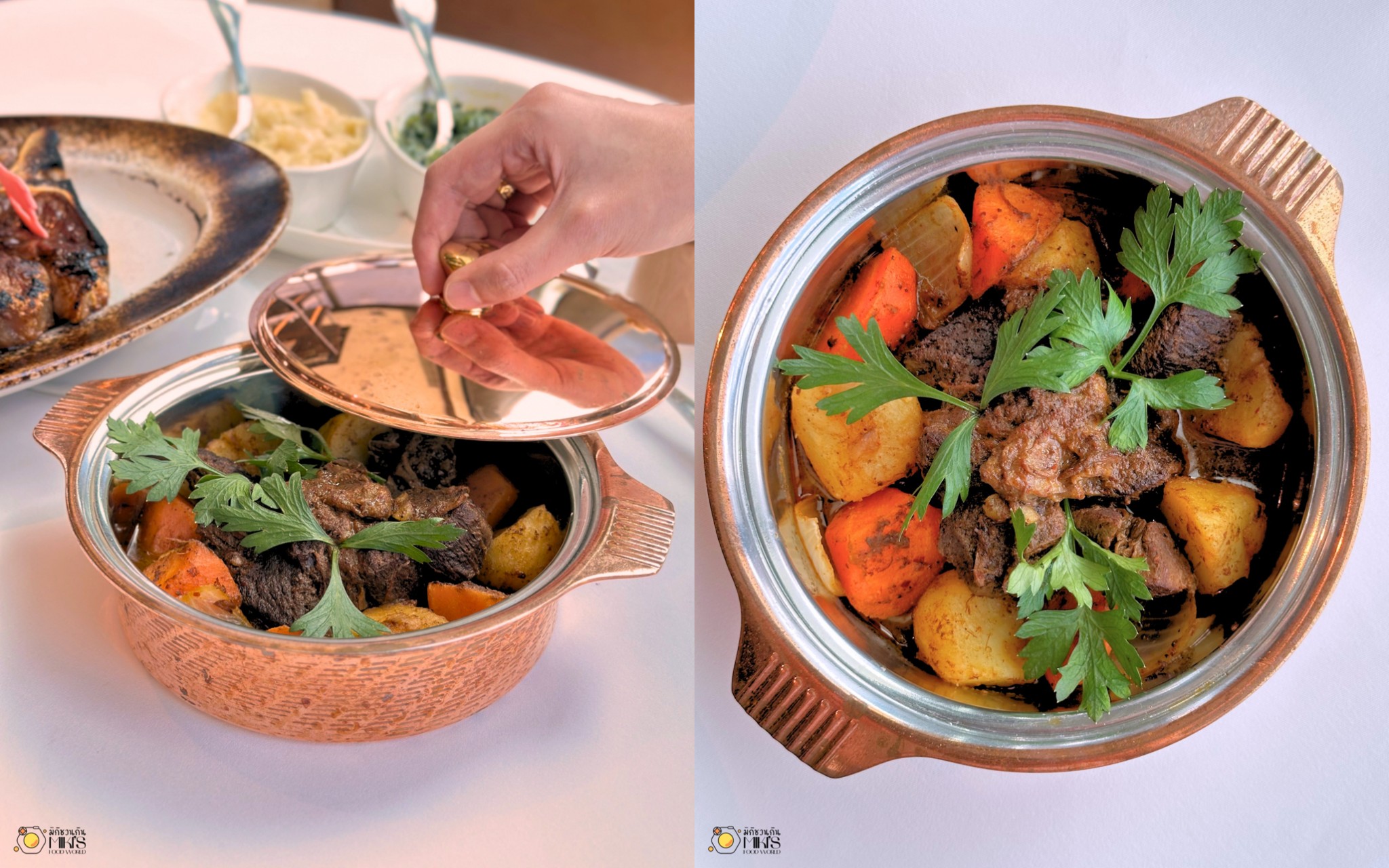 BEEF STEW MASSAMAN (680+) เมนูที่เชฟนำรสชาติความเป็นไทย มาผสมผสานกับความพรีเมียมในแบบอเมริกันได้ลงตัว จานนี้ใช้ USDA Prime Beef Chuck Roll นำไปเคี่ยวจนเปื่อยนุ่มแทบไม่ต้องใช้มีด ปรุงด้วยเครื่องแกงมัสมั่นและเครื่องเทศแบบไทยแท้ แต่ยังคงความละมุนในสไตล์ยุโรป เสิร์ฟคู่ข้าวสวยร้อนๆ รสเข้มข้น และเต็มไปด้วยความใส่ใจในรายละเอียด เหมือนรวมความอร่อยของสองชาติไว้ในจานเดียว