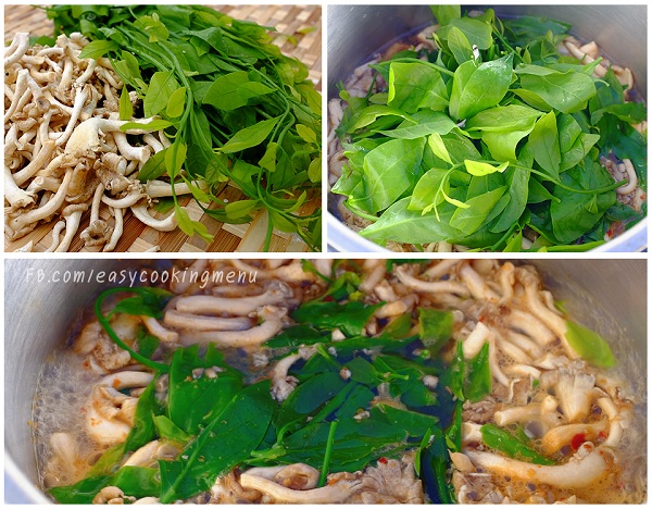 2. พอน้ำเดือดใส่เห็ด ต้มจนเดือดอีกครั้ง ใส่ผักหวาน พอผักสลด ปิดไฟ ตักใส่ถ้วย พร้อมเสิร์ฟ