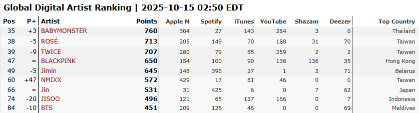 BABYMONSTER เป็นศิลปินเคป๊อปที่อยู่อันดับสูงสุดในอุตสาหกรรมเคป๊อปบน Global Digital Artist Ranking โดยยืนอยู่ที่อันดับ 35 จากบรรดาศิลปินชื่อดังทั่วทั้งโลก สำหรับศิลปินที่