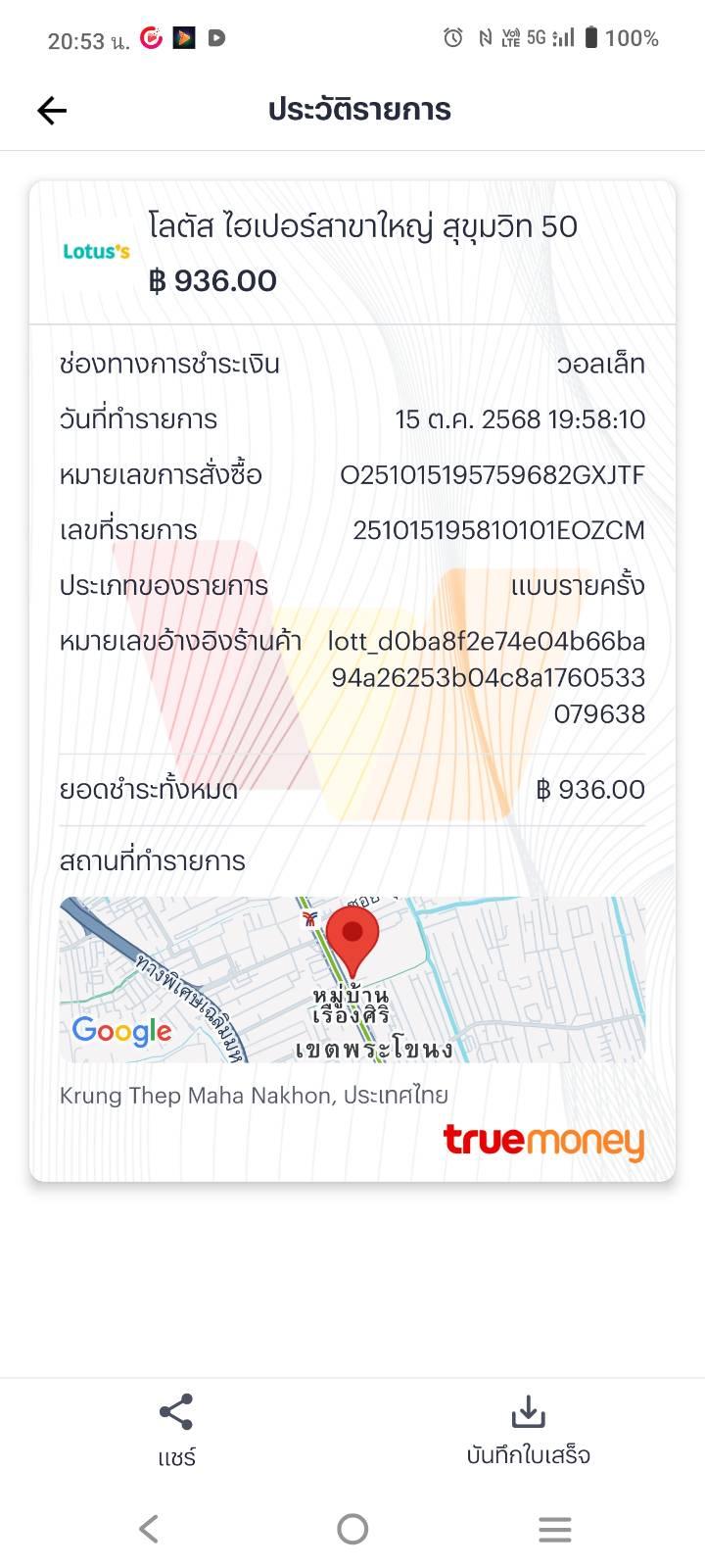 สั่งโลตัสออนไลน์ วันที่ 15/10/2568 ชำระด้วยทรูมันนี่วอเล็ทไม่มียอดเงินคืน