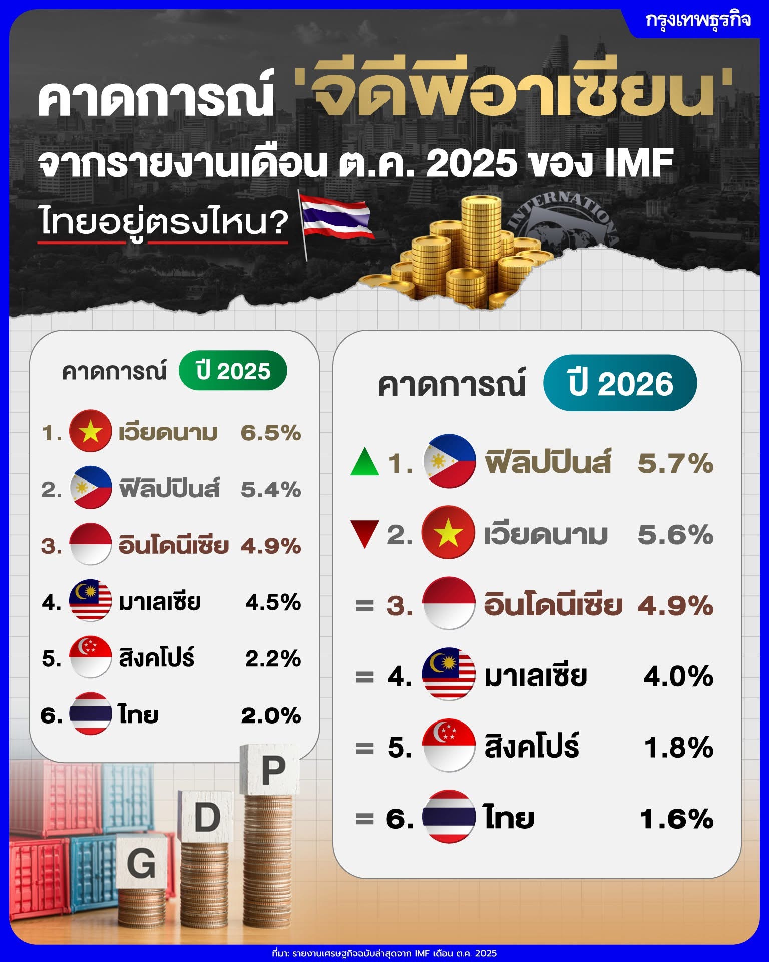 รายงานเศรษฐกิจโลก (WEO) ฉบับเดือนต.ค. 2025 ของกองทุนการเงินระหว่างประเทศ (IMF) คงอัตราการเติบโตของเศรษฐกิจไทยไว้ที่ 2% และ 1.6% ในปีหน้า ซึ่งคาดการณ์นี้ยังสอดคล้องกับตัวเลขในรายงานฉบับปรับปรุงเดือนก.ค.ที่ผ่านมา และคาดการณ์ที่เพิ่งออกมาในเดือนต.ค. ของธนาคารโลกอีกด้วย