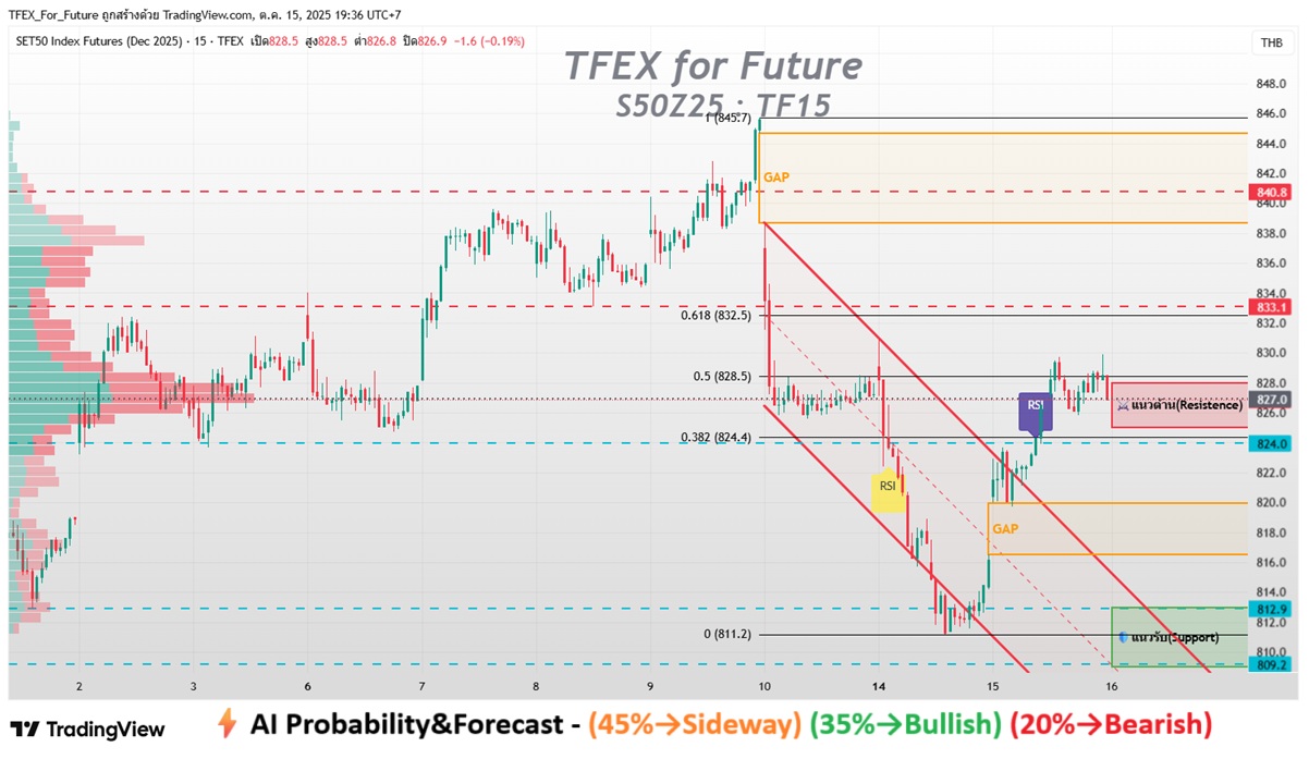 🔹 45% → Sideway 824–833 (แกว่งในกรอบพักฐาน)