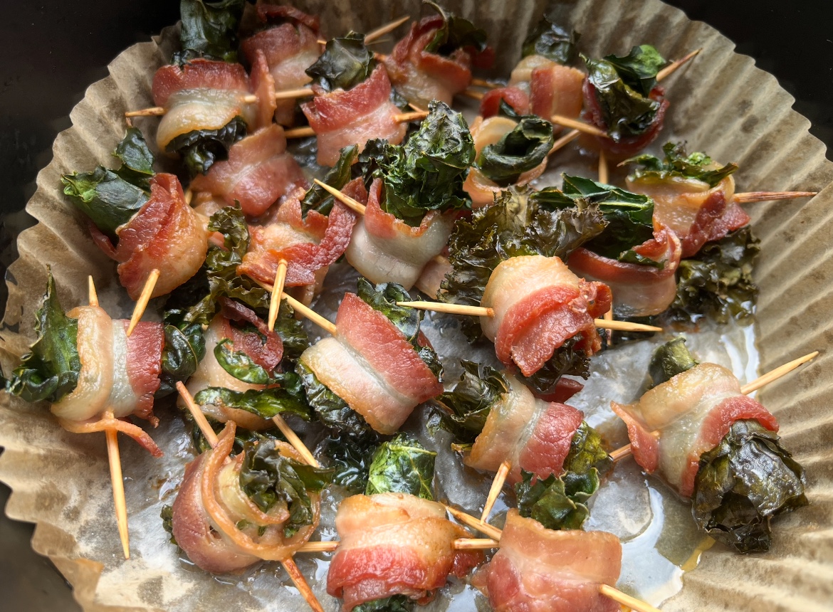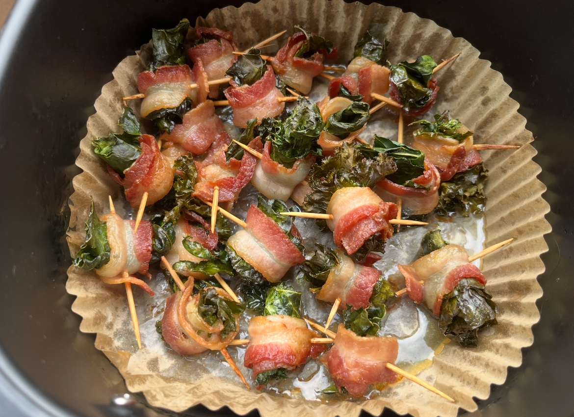 เมนูเช้านี้เลยจัด เบค่อนพันผักเคล แล้วใส่ในหม้ออบลมร้อนค่ะ