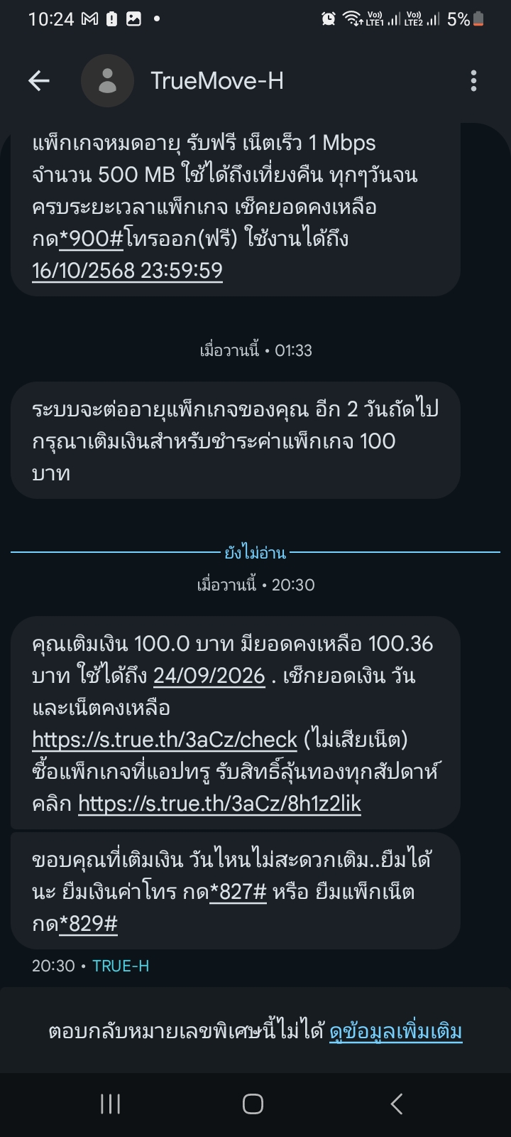 ตามกำหนดต้องต่อโปรเน็ตให้ วันที่ 16 ต.ค. 68 เวลาเที่ยงคืน แต่ระบบไม่ต่อให้ เงินก็เติมไว้เรียบร้อย โทรไป 1242 ก็รอเจ้าหน้าที่รับสายเกิน 30 นาที ยังไม่ได้คุยกับคน เสียค่าโทรศัพท์ไปคอลเซ็นเตอร์ตะ 50 บาทแ