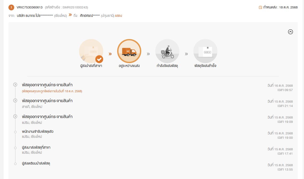 พัสดุหมายเลข VRIC7530360613 มีกำหนดส่งวันที่ 18 ตุลาคม 2568 สำหรับเลขพัสดุดังกล่าวเป็นการจัดส่งหลังเวลาตัดรอบสาขาแม่ริม เวลาตัดรอบ 17.00 น. โดยปกติพัสดุจะเทียบเท่ากับเป็นรอบวันถัดไปค่ะ แต่กรณีนี้เจ้าหน้าที่มีการเข้ารับพัสดุในรอบเมื่อวานค่ะ โดยปกติแล้วหากสามารถจัดส่งพัสดุได้ก่อนกำหนด เจ้าหน้าที่จะบริการนำส่งให้แก่ลูกค้าก่อนเป็นปกตินะคะ คุณลูกค้าสามารถตรวจสอบสถานะเพิ่มเติมได้ที่ https://th.kex-express.com/th/home , KEX Application และ Line Official ค่ะ