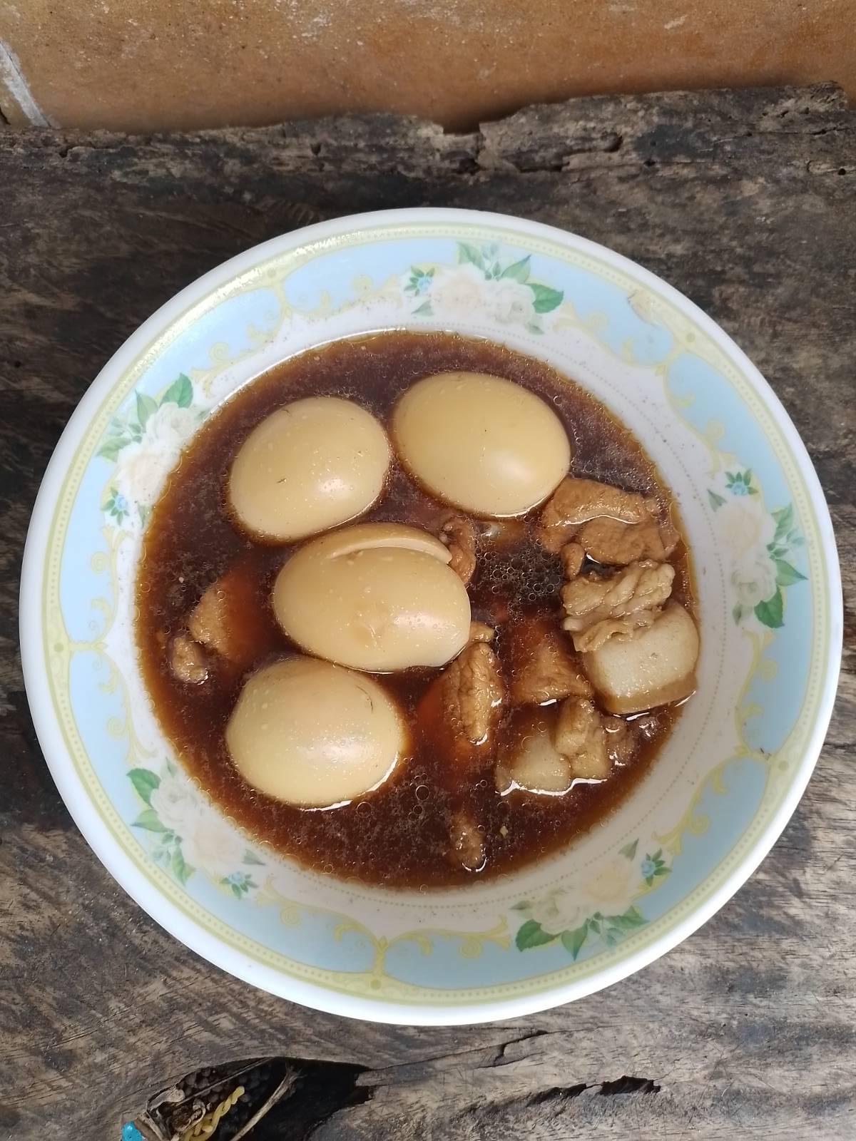 ต้มไข่ก่อนเป็นอย่างแรกเลย พอไข่สุกก็นำมาปลอกแล้วพักไว้ จากนั้นก็นำหมูสามชั้นไปผัดกับผงพะโล้ ไม่ต้องให้หมูสุกมากนะคะ พอให้ผงพะโล้มันซึมเข้าไปในหมูนิดหน่อยก็พอ จากนั้นก็ตั้งน้ำ ใส่ซุปก้อนลงไป เมื่อซุปละลายก็ใส่หมูที่ผัดเมื่อครู่ลงไป จากนั้นก็ใส่ไข่ต้มที่ปลอกเอาไว้ตอนแรก ตามด้วยซีอิ้วดำหวาน ปรุงรสด้วยน้ำตาลและเกลือเล็กน้อย ชิมให้ได้รสหวานนำแล้วเค็มตาม จากนั้นก็ตุ๋นไปเรื่อย ๆ ให้หมูนุ่ม และให้ไข่กลายเป็นสีน้ำตาล เมื่อได้ทุกอย่างตามต้องการแล้วก็ปิดไฟ ตักเสิร์ฟได้เลย