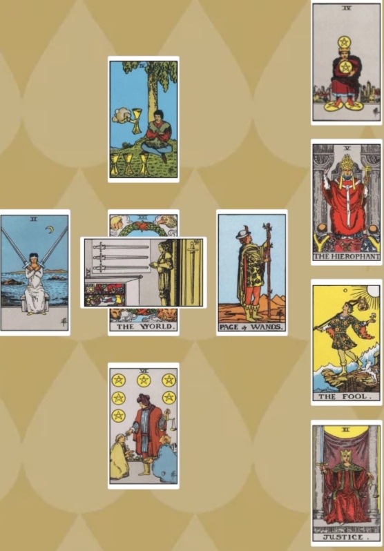 ไพ่ The World ประกบกับไพ่ 4 ดาบ
