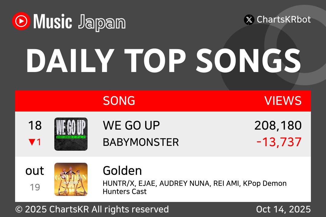 เพลง WE GO UP ของ BABYMONSTER อยู่ในอันดับที่ 18 บน YouTube Music Japan Daily Chart เป็นเพลงเดียวจากเคป๊อปที่ยังอยู่ในชาร์ต ส่วนเพลง Golden จาก KPOP Demon
