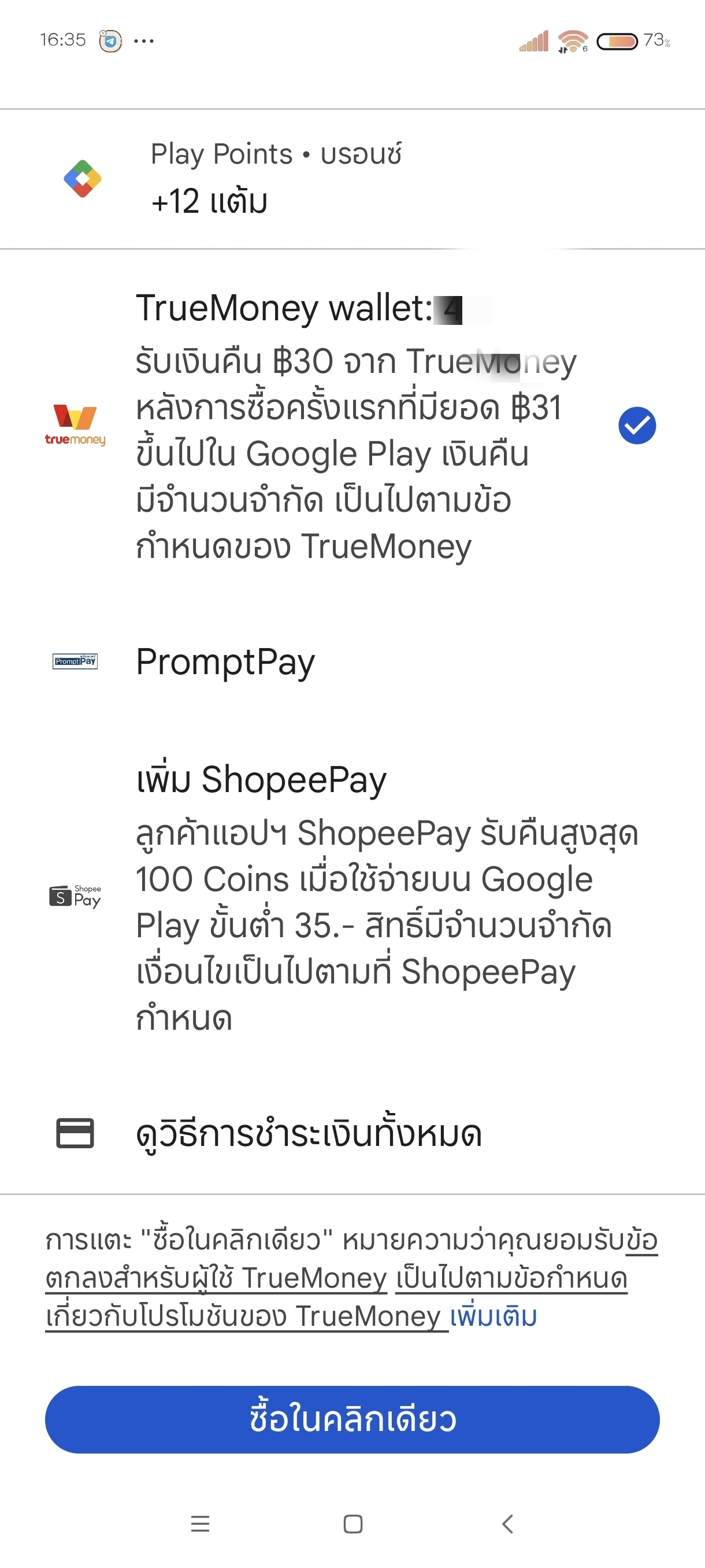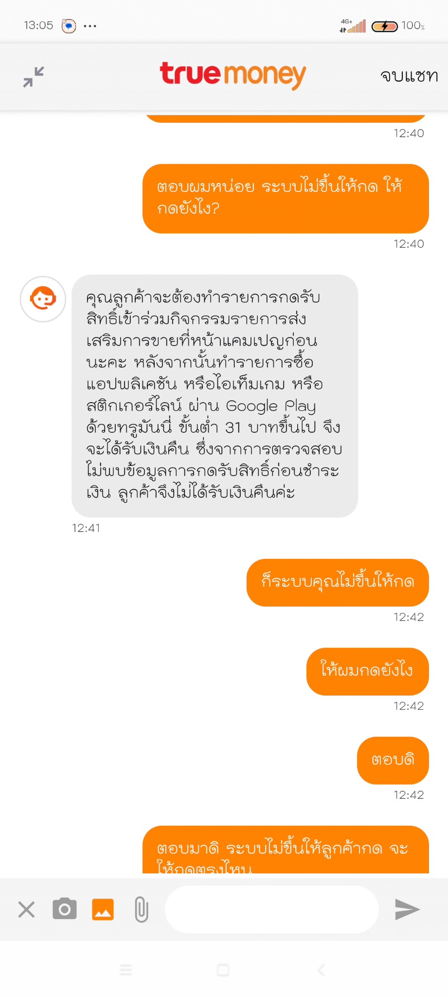 ใครเป็นบ้างครับ truemoney ห่วยแตก ทำแคมเปญบอกใช้จ่ายผ่านgoogleplay 31บาทขึ้นไปได้เงินคืน30บาท ตอนนี้ยังไม่ได้ เงินคืนเลย ติดต่อเจ้าหน้าที่ไปบอกลูกค้าไม่กดรับสิทธิ์