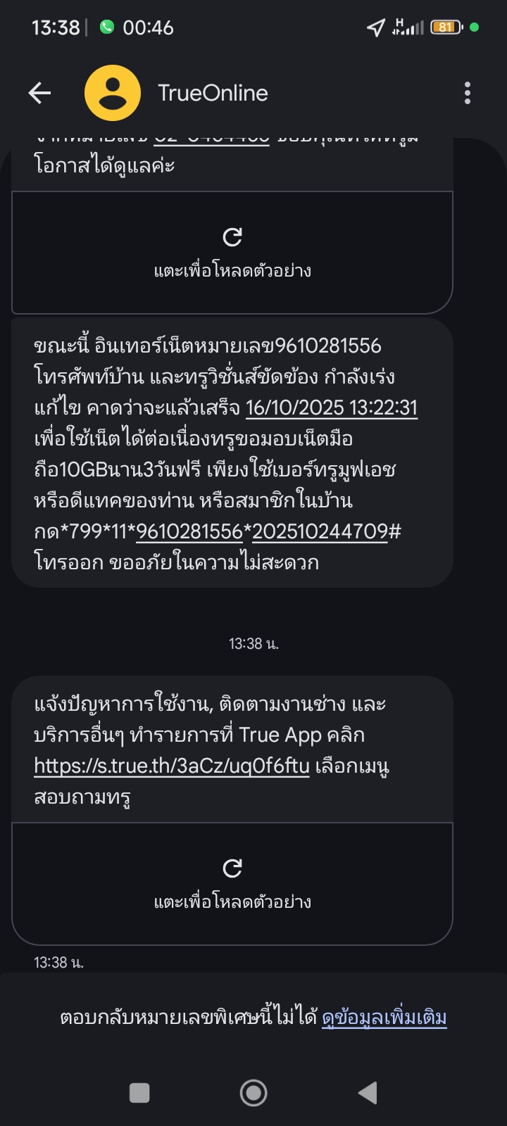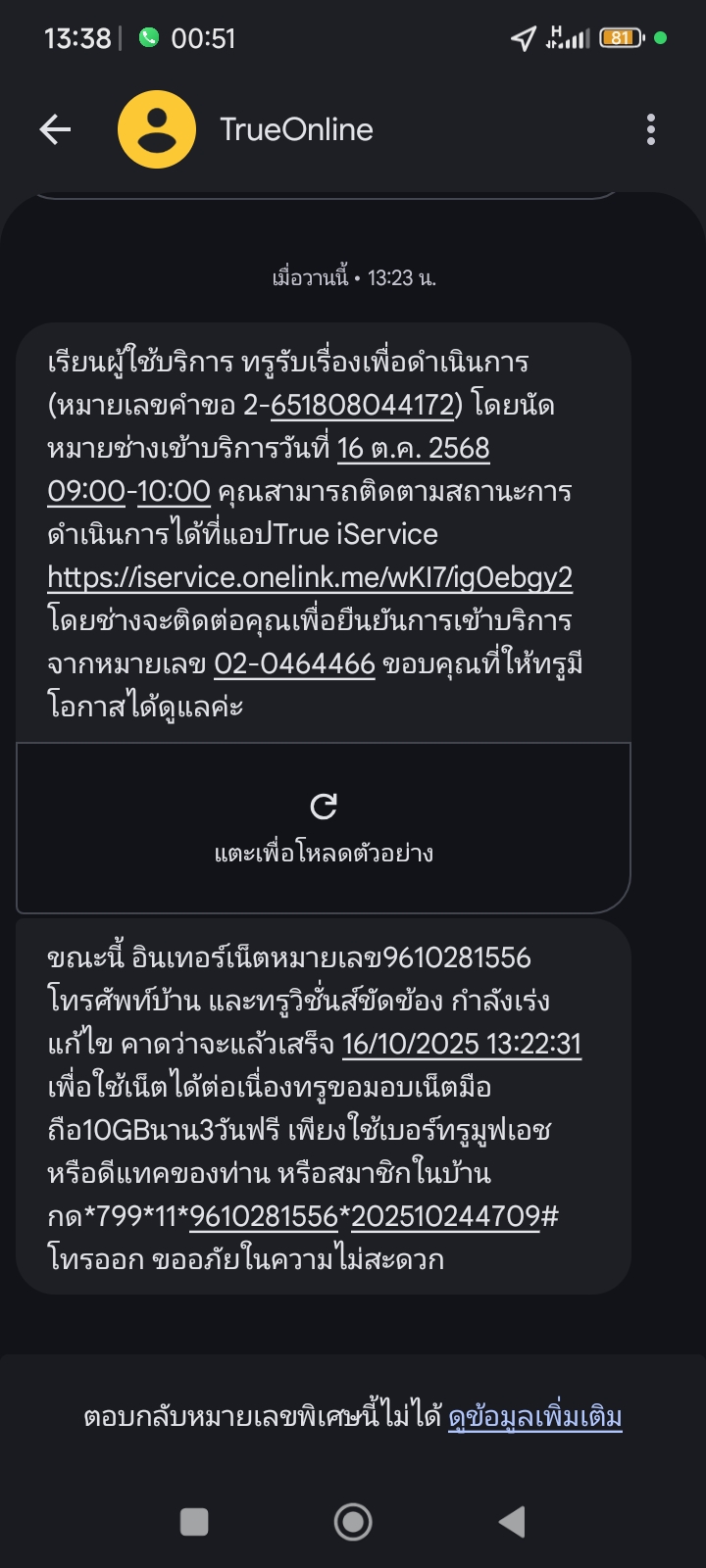 WiFi มีปัญหาตั้งแต่เมื่อวานตอนบ่ายนัดช่างเข้ามาทำแล้วใน app วันนี้ตั้งแต่ 9 โมงถึง 10 โมงแต่ก็ไม่มีคนโทรมา 11:00 น ฉันตื่นมาเช็คใน app บอกพื้นที่มีปัญหาจะเร่งแก้ไขเลยไม่ส่งช่างเข้ามาจะแล้วเสร็จประมาณบ่าย 1.22 น.จนตอนนี้จะบ่ายสองแล้วฉันก็เลยเข้า app ใหม่อีกรอบนึงตอนแรกบอกมีปัญหาในพื้นที่ตอนนี้บอกไม่มีปัญหาแล้วแต่ฉันนัดช่างก็ไม่มาทำคืออะไรสรุปจะทำไม่ทำ พอโทรเข้าเบอร์ศูนย์ก็ให้คุยแต่กับมะลิคุยได้มั้งเป็น AI คุยอะไรก็ไม่รู้เรื่องพอพอโทรเบอร์หางานช่างที่จะนัดที่ส่งมาตามข้อความก็ให้ถือสายรอตั้งนานไม่มีใครมาคุยสักที จะคุยกับมะลิใน app จะคุยติดต่อกับเจ้าหน้าที่ก็ติดต่อไม่ได้ #ทรูออนไลน์
