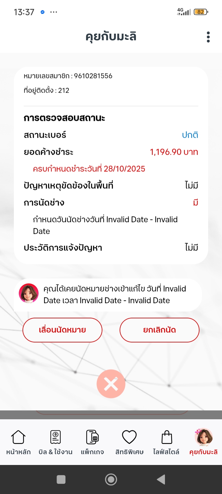 ทรูมูฟไวไฟบ้านของฉันใช้งานไม่ได้ตั้งแต่เที่ยงฉันโทรคุยกับ 1242 ให้ AI มาคุยบอกนัดช่างให้จะมาทำวันนี้วันที่ 1 มีนาคมเวลา 17:00 น - 18:00 น นัดช่างให้ฉันแล้วแต่เพราะฉันเข้า app ดูตอนแรกแอปใช้งานไม่ได้ ว