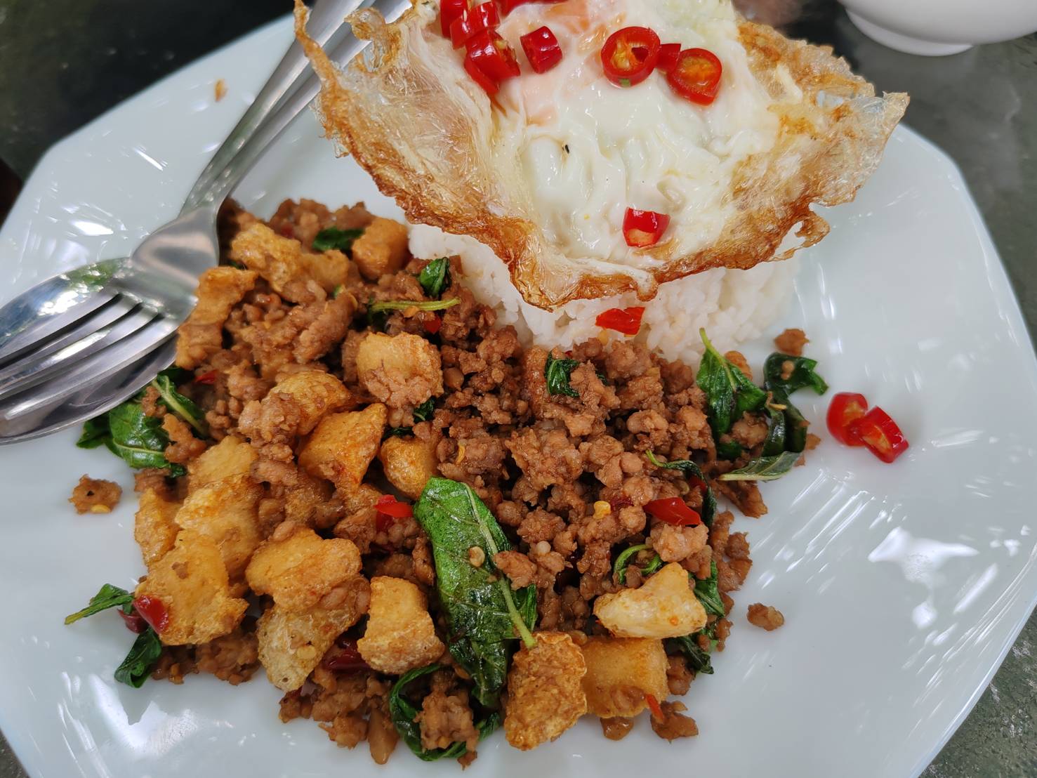 มีข้าวด้วยนะ ผมขอแนะนำ กะเพราหมูสับกากหมูไข่ดาวววว 60.- + ไข่ดาว 10 บาท อร่อยครับจานนี้