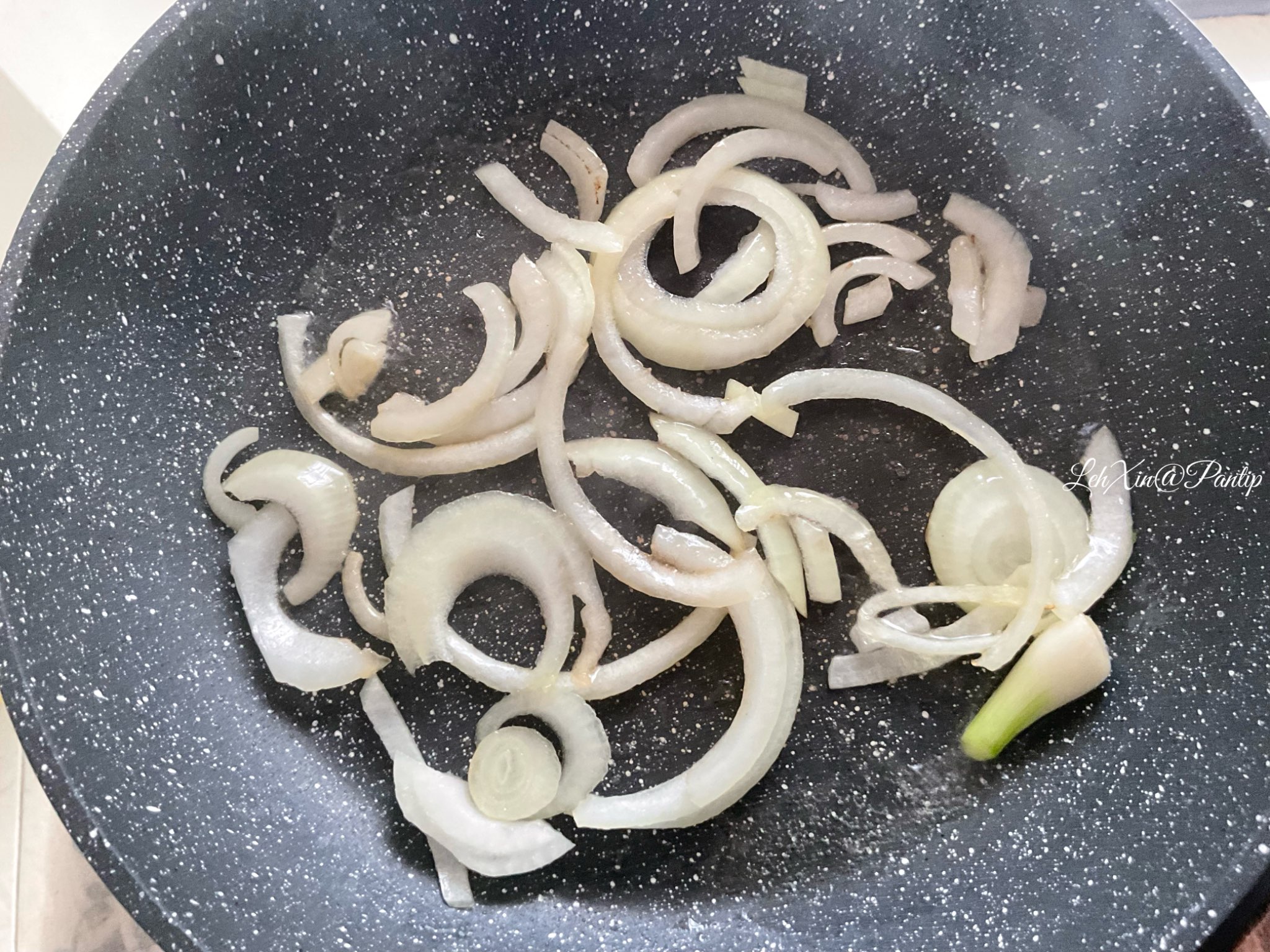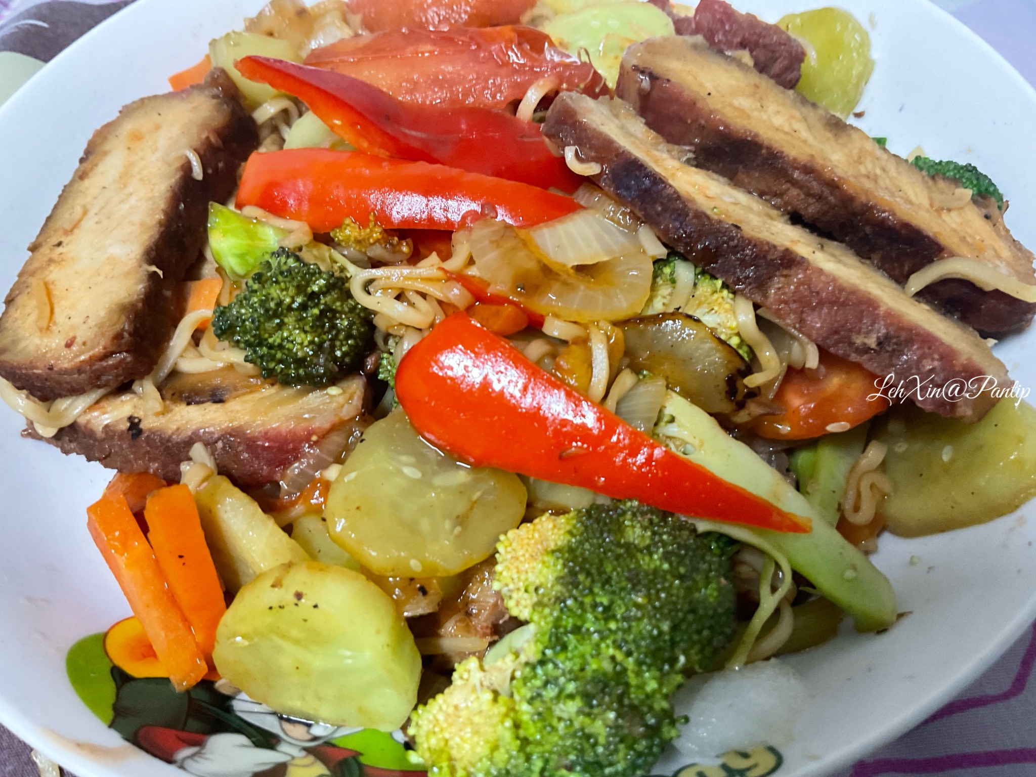 ตั้งกระทะ เปิดไฟ เมื่อร้อนเทน้ำมันพืชลงไป เทหอมหัวใหญ่ และต้นหอมส่วนที่เป็นสีขาวลงไปผัดจนเริ่มมีกลิ่นหอม เทแตงกวา บรอกโคลีลงไปผัด เหยาะซีอิ๊ว ผัดให้เข้ากัน เทมะเขือเทศ แครอทลงไป เมื่อเริ่มสุก ตักน้ำเทลงไปให้ท่วมผัก รอจนเดือด ใส่น้ำตาลทราย 2 ช้อนโต๊ะ เมื่อละลายใส่น้ำส้มสายชู 2 ช้อนโต๊ะ เทหมูแดงลงไป ผัดคลุกเคล้าให้เข้ากัน คราวนี้ใส่ซอสมะเขือเทศไปด้วย 2 ช้อนโต๊ะ เพราะตอนชิมรู้สึกว่ารสยังไม่กลมกล่อม เทแป้งข้าวโพดผสมน้ำลงไป ผัดให้เข้ากัน เทบะหมี่ลงไปผัดคลุกเคล้า ใส่พริก ต้นหอมส่วนที่เป็นสีเขียวลงไป จากนั้นปิดไฟ