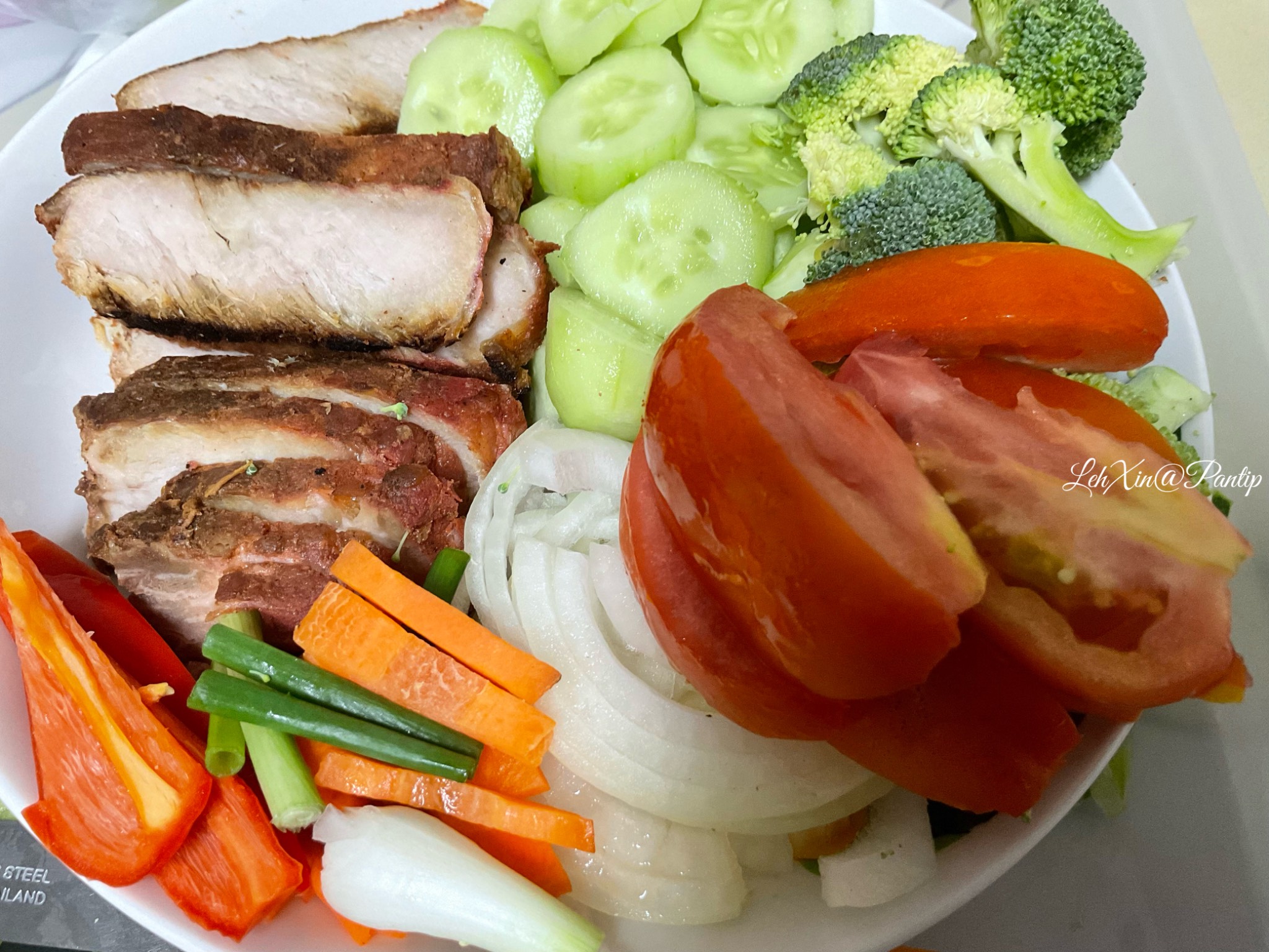 สวัสดีค่ะ วันนี้พอเสร็จงาน ฝนก็ตกหนัก ออกไปซื้ออะไรกินไม่ได้ ค้นในตู้เย็นเจอหมูแดงที่แม่ทำมาให้แช่อยู่ในช่องฟรีซ เลยเอามาทำอาหารเย็น