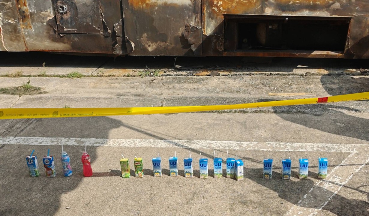 ภาพแรกที่เห็นคือกล่องนมของเด็ก ๆ วางเรียงอยู่หน้ารถบัสที่ถูกไหม้...