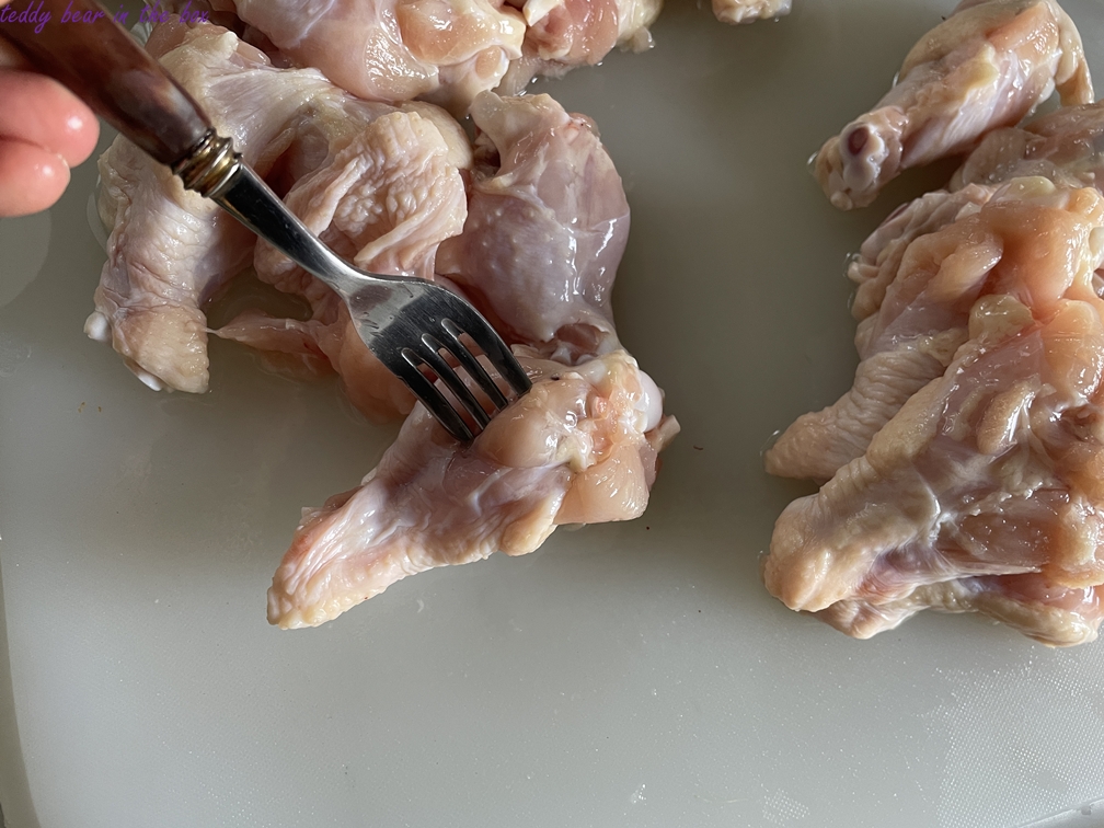 เอาส้อมจิ้มเนื้อปีกไก่ เพื่อให้เกลือและซอสต่างๆซึมเข้าเนื้อ