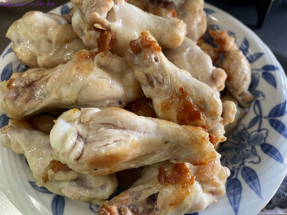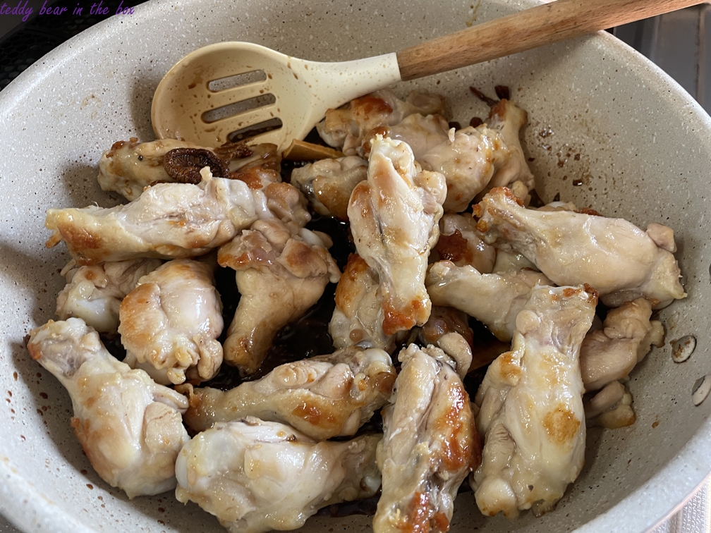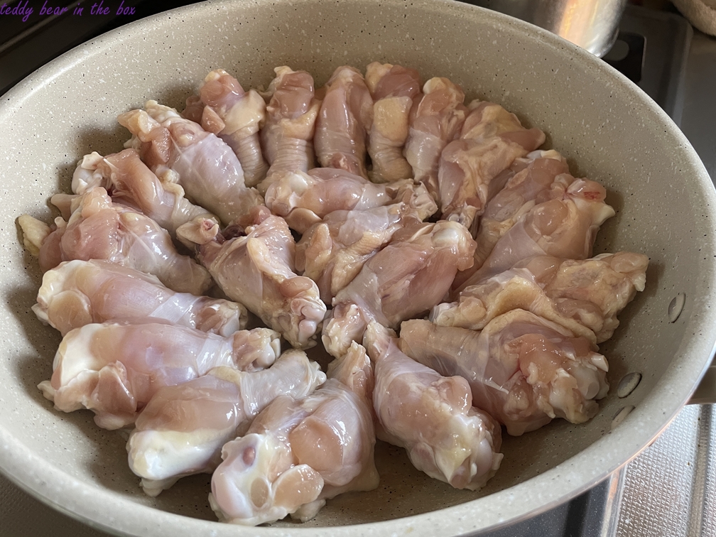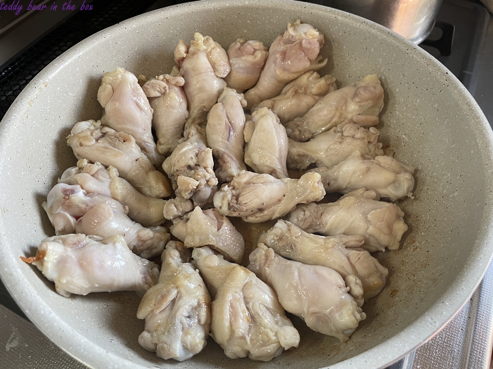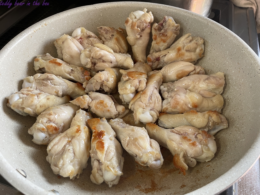 ตั้งกระทะ ใส่ปีกไก่ลงจี่ให้หนังเหลือง ไล่น้ำมันออก