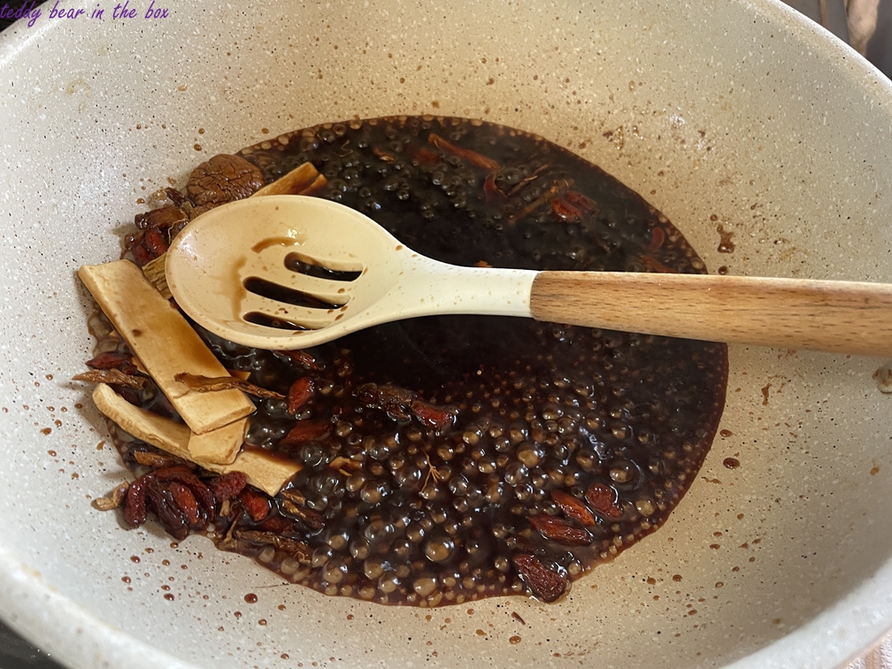 ใส่น้ำลงกระทะนิดหน่อย ใส่น้ำตาลอ้อยและเกลือเคี่ยวให้เดือด ใส่เครื่องยาจีนลงคน