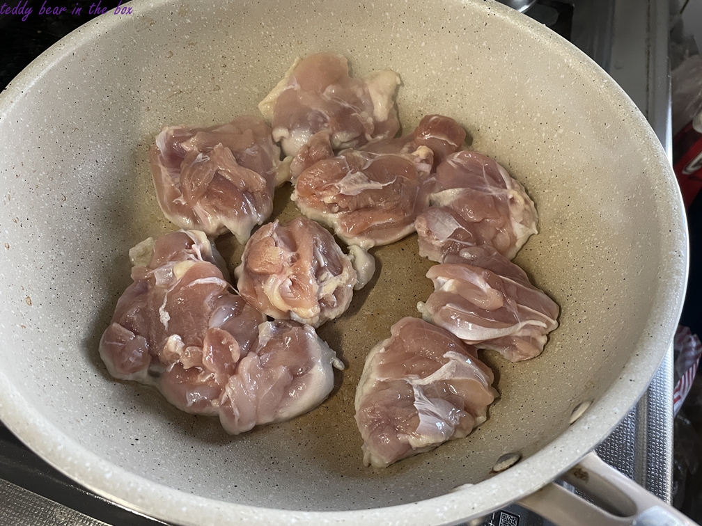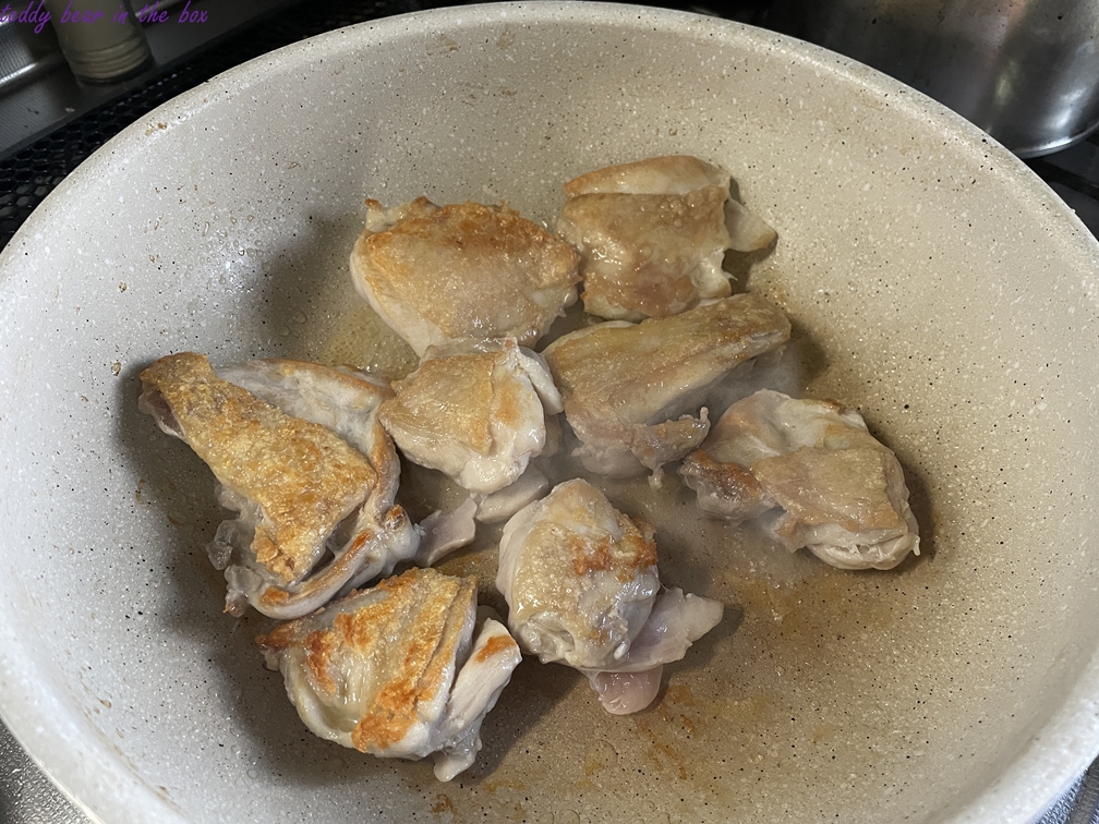 ตั้งกระทะให้ร้อน เอาไก่ส่วนหนังลงจี่ ให้เหลืองและรีดน้ำมันออก
