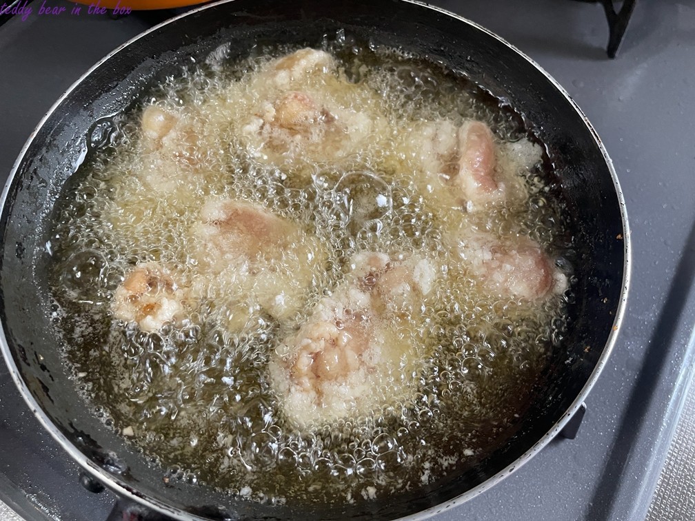แล้วคลุกด้วยแป้งมันฝรั่งหรือแป้งสาลี ก่อนนำไปทอดในน้ำมันร้อนจัด ให้ผิวกรอบ ด้านในนุ่มชุ่มฉ่ำ คาราอาเกะเป็นที่นิยมมากในญี่ปุ่น