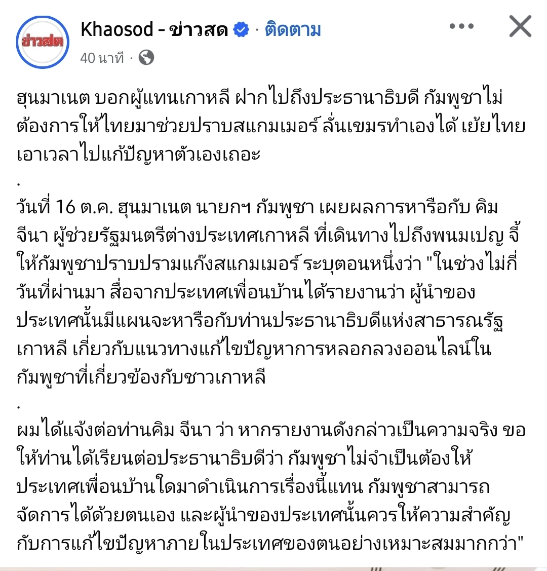 เขมรส่งสัญญาณขู่ ไม่ให้ไทยทลายรังสแกมเมอร์
