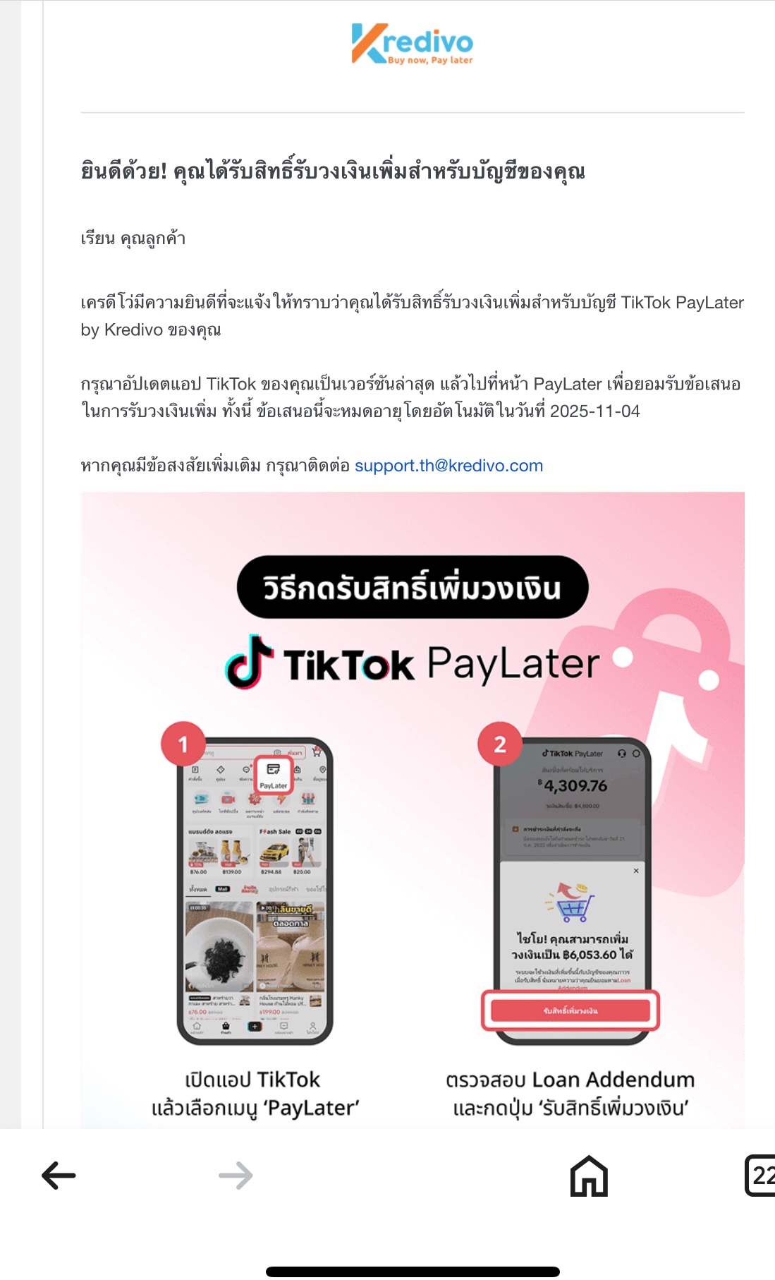ติ๊กต๊อก มีเมลเเจ้งเตือน เพิ่มวงเงิน แต่พออัปเดต เข้าติ๊กต๊อกแล้ว ทำไมถึงไม่มีขึ้นว่าให้ รับสิทธิ์คะ