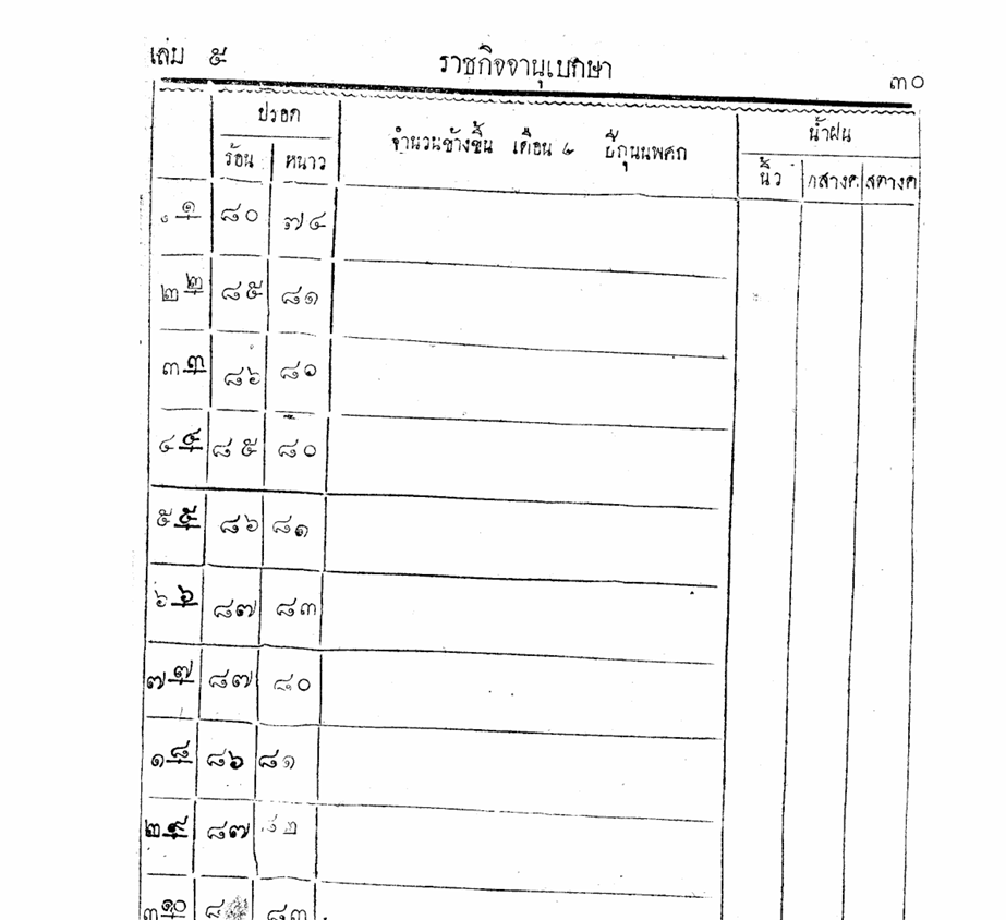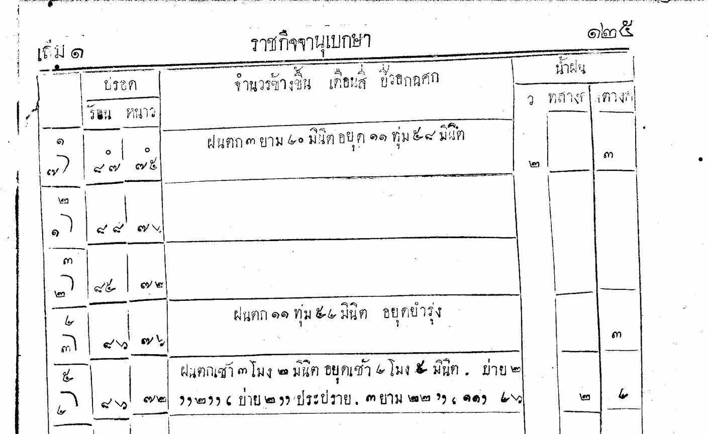 ผมเจอราชกิจจานุเบกษาหน้านี้ ผมแปลกใจเล็กน้อย คือ บันทึกอุณหภูมินี้ สถานีอะไร? แล้วการวัดน้ำฝนแบบ นิ้ว ทสางค์ สตางค์ คืออะไร