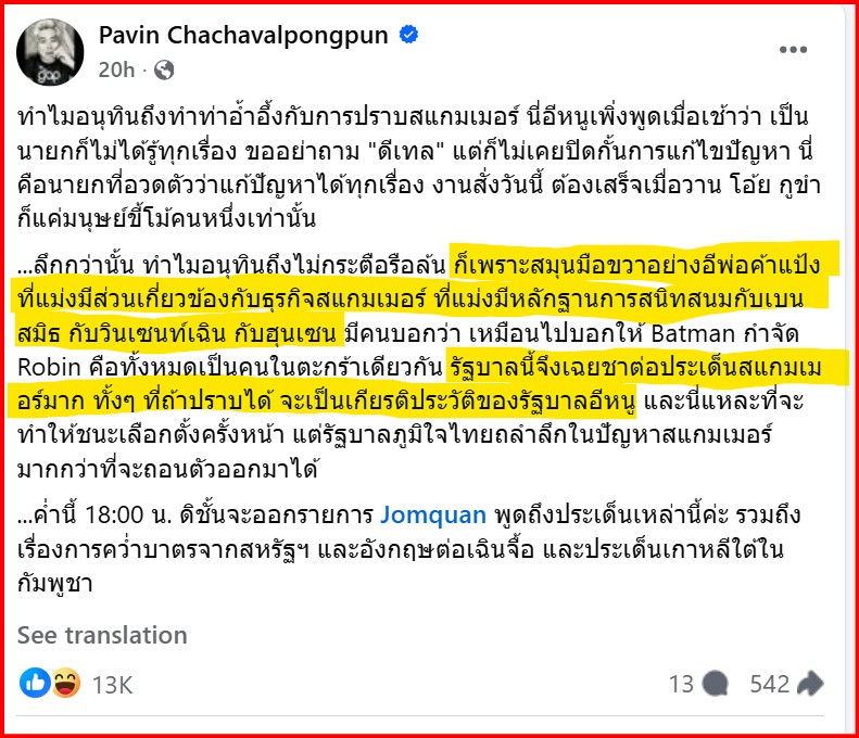 พวกระดับรัฐมนตรีที่อยู่ในเครือของพรรคภูมิใจไทย มีเอี่ยวกับพวกแก๊งค์คอลเซนเตอร์ สแกมเม่อร์ ข้ามชาติ