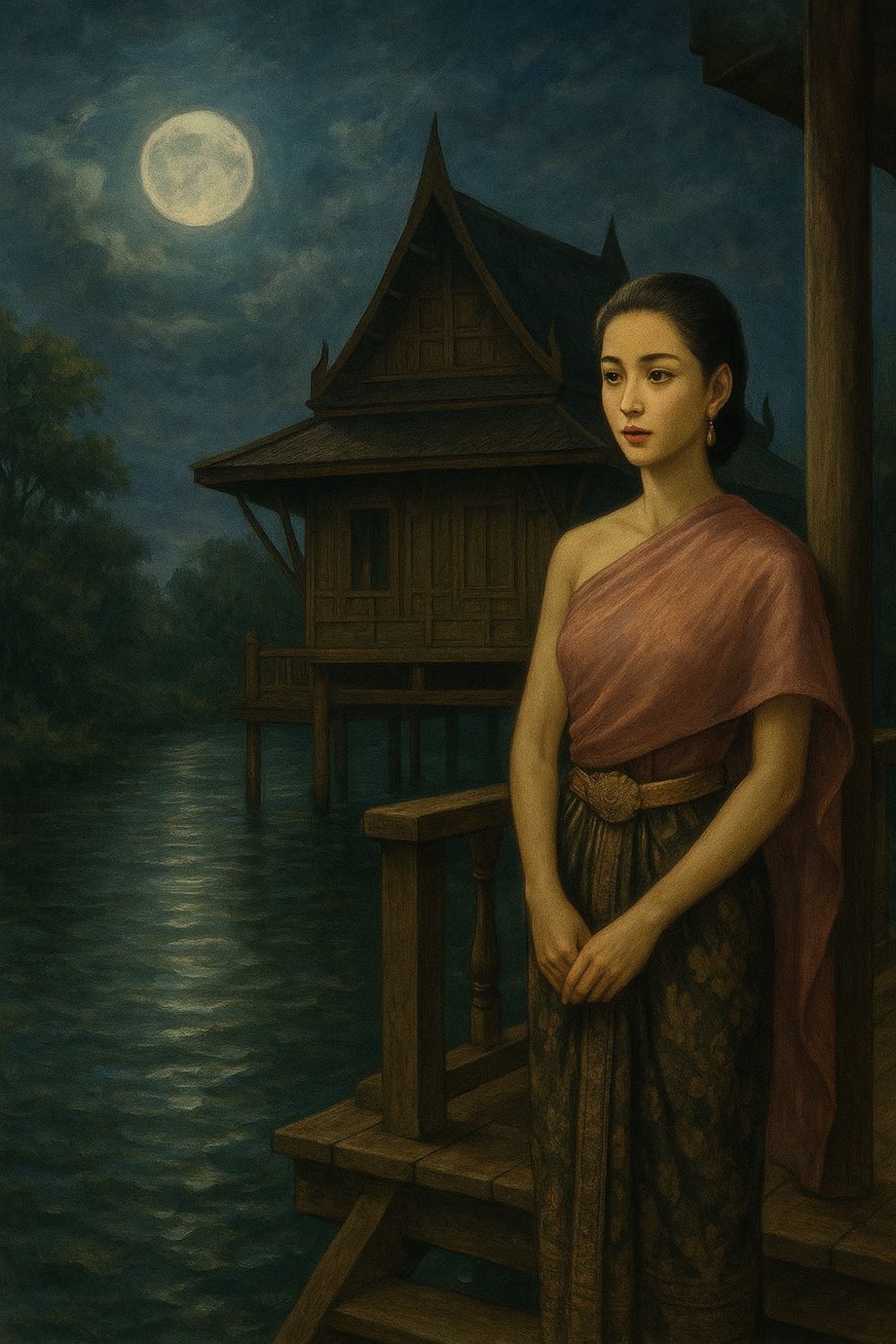 ค่ำคืนหนึ่งในช่วงปลายรัชกาลที่ ๖ แสงจันทร์ริบหรี่ลอยเคว้งอยู่เหนือผืนน้ำคลองที่สงบนิ่ง บรรยากาศรอบด้านเงียบสงัดจนได้ยินเพียงเสียงจิ้งหรีดเรไรระงมอยู่ไกล ๆ และเสียงลมพัดต้องยอดไม้ไหวเบา ๆ สะท้อนเงาเรือนไทยไม้สักริมคลองหลังงามหลังนั้นลงบนผิวน้ำเป็นภาพพร่าเลือน ใต้เงาจันทร์ซีดเซียวที่พาดลงมาบนชานเรือน ยืนร่างหญิงสาวผู้หนึ่งในชุดผ้าไทยสีขาว เธอยืนนิ่งสงบ มือโอบกระชับห่อผ้าขาวเล็ก ๆ ราวกับอุ้มทารก ท่ามกลางความเงียบมีเสียงสะอื้นแผ่วเบาหลุดจากริมฝีปากของหญิงสาวคนนั้นก่อนจะเงียบหายไปในสายลมค่ำคืน ทันใดนั้นเสียงกรีดร้องโหยหวนดังกึกก้องขึ้นข้ามความเงียบ เสียงนั้นเต็มไปด้วยความทุกข์ทรมานและความแค้นเคือง ร่างขาวซีดนั้นพลันกระโจนลงจากชานเรือนไปสู่สายน้ำเบื้องล่าง เกิดระลอกน้ำกระเพื่อมกระจายเป็นวงกว้างก่อนผืนคลองจะกลับคืนสู่ความเรียบนิ่งดังเดิม ราวกับว่าไม่เคยมีสิ่งใดเกิดขึ้น มีเพียงเสียงหมาหอนรับเป็นระยะและเสียงฟ้าร้องคำรามอยู่ลิบ ๆ บ่งบอกลางร้ายของโศกนาฏกรรมที่ซ่อนเร้นอยู่ในเรือนไทยริมน้ำแห่งนี้