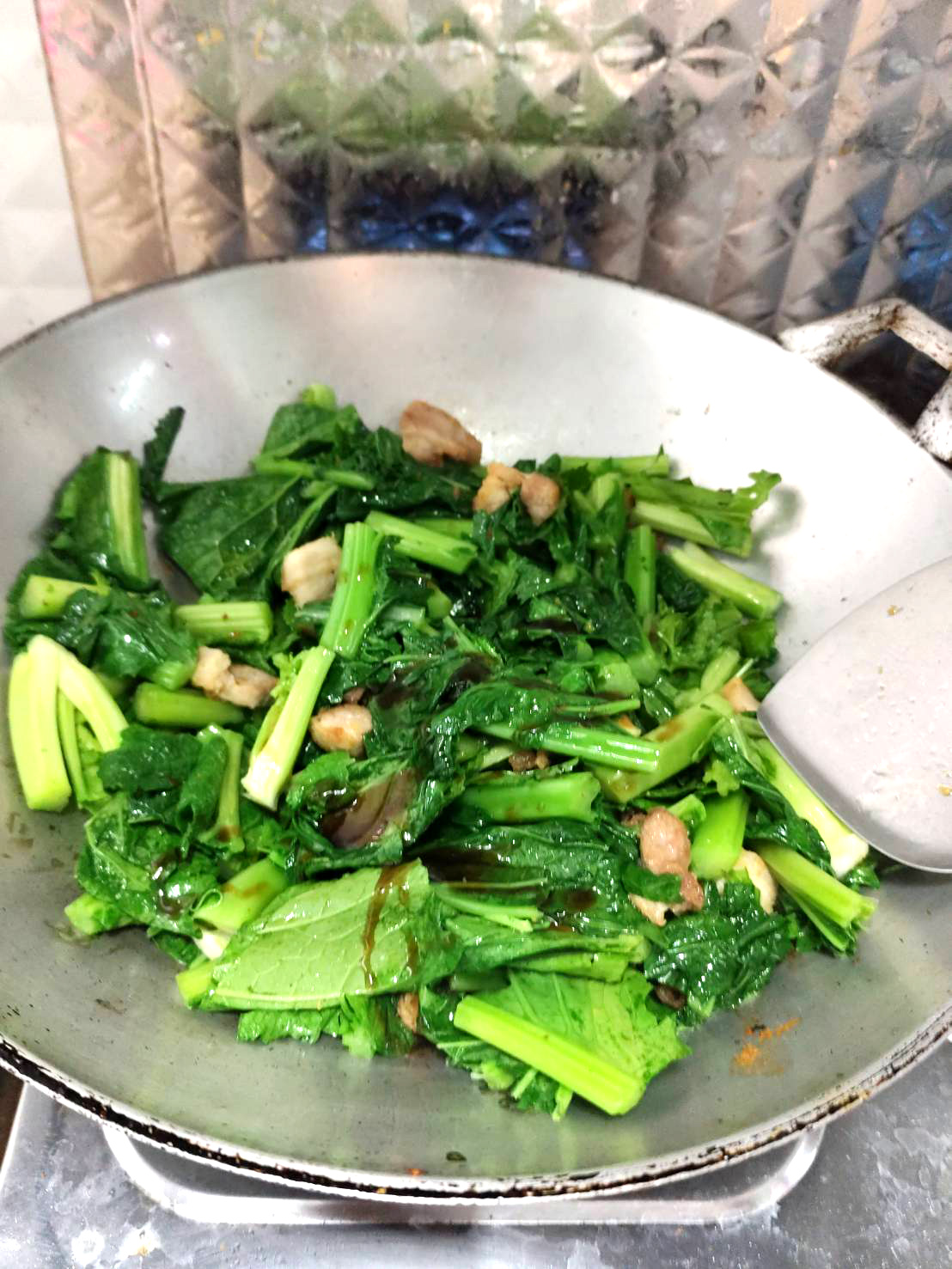 แล้วใส่ชุงฉ่ายลงไปผัดกับหมูสามชั้น