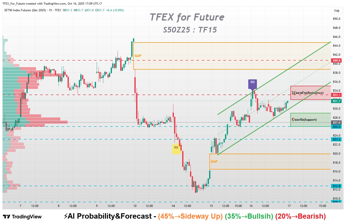 🔹 45% → Sideway Up (แกว่งขึ้นในกรอบ 826–835)