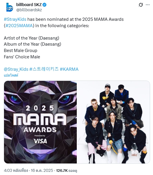 🔥 Stray Kids จะแสดงในงาน MAMA Awards 2025! และได้รับการเสนอชื่อเข้าชิงรางวัลแดซัง 2 ประเภทและอื่นๆรวมเข้าชิง 4 ประเภท